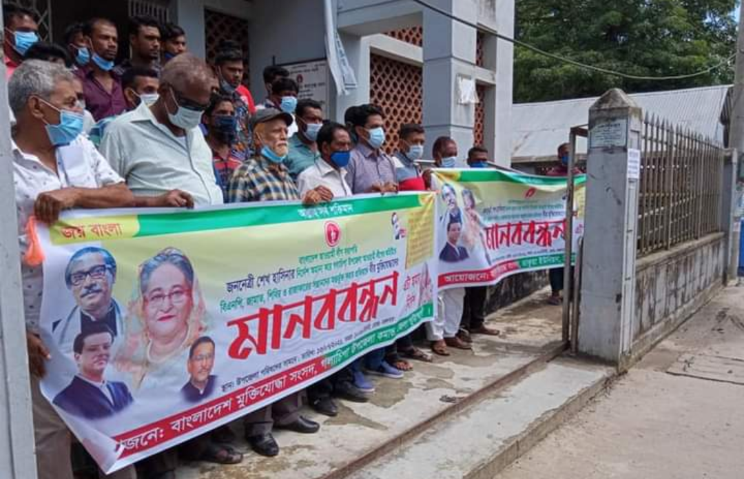মানববন্ধনে বীর মুক্তিযোদ্ধাগণ, মুজিব আদর্শে বিশ্বাসী ও ত্যাগী আওয়ামী লীগ সমর্থকগণ উপস্থিত ছিলেন।