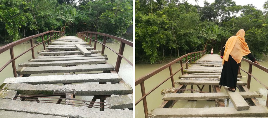 সোমবার সরেজমিন গিয়ে দেখাগেছে, সেতুটির বিম নড়বরে। স্লাব খুলে খালে পড়ে আছে। স্লাব না থাকায় সেতুর অনেক স্থান ফাঁকা। আড়াআড়ি ভাবে স্লাব দিয়ে মানুষ জীবনের ঝুঁকি নিয়ে চলাচল করছে।
