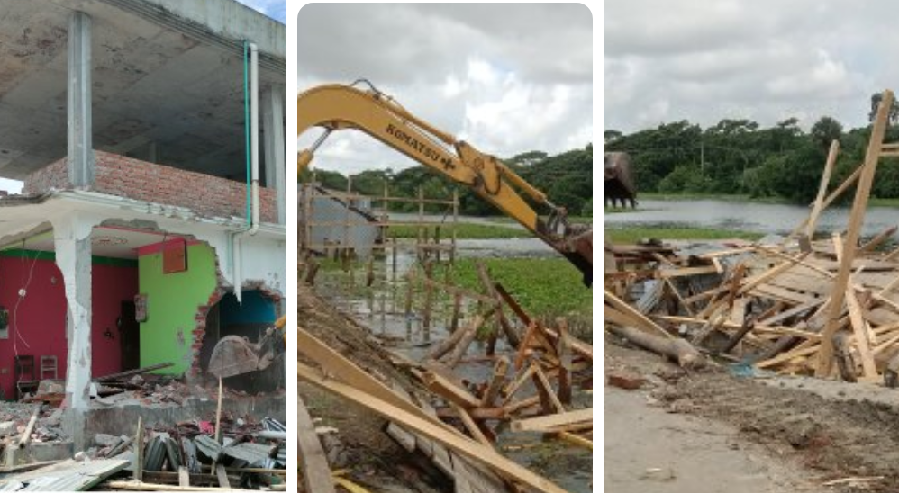 বুধবার সরেজমিনে গিয়ে দেখা গেছে, কচুপাত্রা খালের ব্রীজের দু’পাশে লাল পতাকা টানিয়ে অবৈধ স্থাপনা প্রশাসনের লোকজন দাড়িয়ে বেকু (এসকেভেটর) মেশিন দিয়ে গুড়িয়ে দিচ্ছেন। আবার কিছু স্থাপনা স্থানীয়রা ভেঙ্গে নিচ্ছেন।
