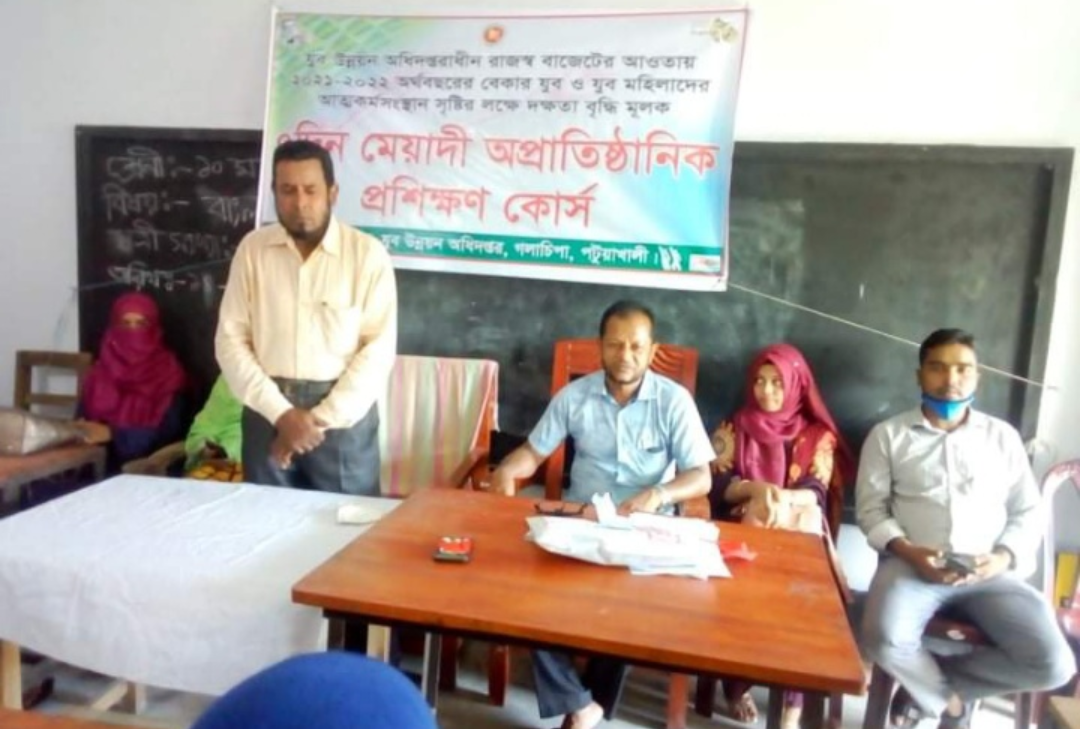 সঞ্জিব দাস, গলাচিপাঃ গলাচিপায় যুব উন্নয়ন অধিদপ্তরাধীন রাজস্ব বাজেটের আওতায়-২০২১-২০২২ অর্থবছরের বেকার যুব ও যুব মহিলাদের আত্মকর্মসংস্থানের লক্ষ্যে দক্ষতা বৃদ্ধি মূলক ৭দিন মেয়াদী অপ্রাতিষ্ঠানিক প্রশিক্ষণ কোর্স এর আয়োজন করা হয়েছে।
