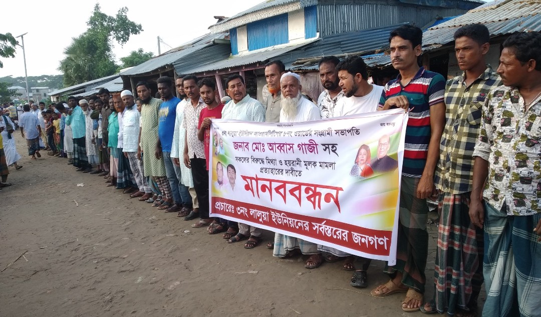 মানববন্ধনে ইউনিয়ন আওয়ামী লীগের সাধারন সম্পাদক ফোরকান প্যাদা বলেন, লালুয়া ইউনিয়নের ৮নং ওয়ার্ড আওয়ামী লীগের সভাপতি আব্বাস গাজী সহ একাধীক আ'লীগ নেতাকর্মী দের নামে জনৈক জাকির মৃধা হয়রানী মুলক মিথ্যা মামলা দেয়।
