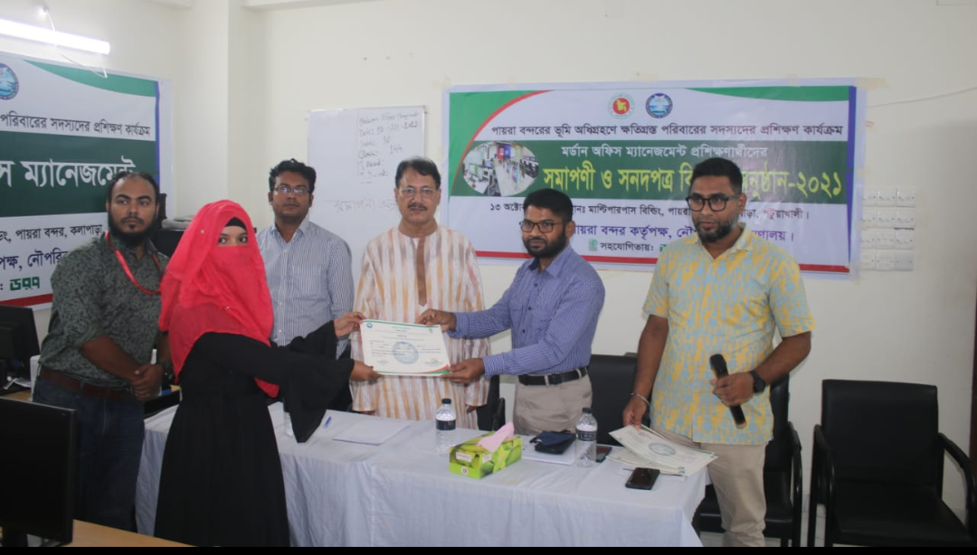 আপন নিউজ অফিসঃ কলাপাড়ায় পায়রা বন্দর নির্মাণে ভূমি অধিগ্রহনে ক্ষতিগ্রস্থ্য পরিবারের সদস্যদের কর্মক্ষম করতে প্রশিক্ষণের মাধ্যমে স্বাবলম্বী করার উদ্যোগ নিয়েছে পায়রা বন্দর কর্তৃপক্ষ। বুধবার সকাল ১০টায় উপজেলার পায়রা পোর্ট এর মালটিপারপাস প্রশিক্ষণ কেন্দ্রে ক্ষতিগ্রস্থ্য সদস্যদের অংশগ্রহনে "মর্ডান অফিস ম্যানেজমেন্ট " বিষয়ক ছয় মাস ব্যাপী প্রশিক্ষণ কোর্স শেষে সার্টিফিকেট বিতরন করা হয়েছে।