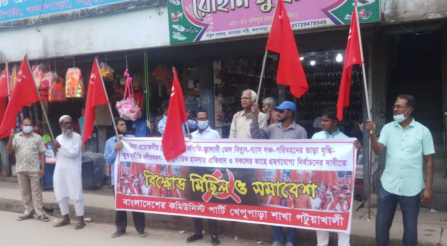 চঞ্চল সাহাঃ কলাপাড়ায় শনিবার (১৩ নভেম্বর) বেলা ১১ টার দিকে পৌর শহরের সুরেন্দ্র মোহন চৌধুরী সড়কের মনোহরীপট্রিতে কমিউনিষ্ট পার্টি খেপুপাড়া শাখার উদ্যোগে বিক্ষোভ মিছিল ও সমাবেশ অনুষ্ঠিত হয়েছে। তেল গ্যাস ও নিত্য প্রয়োজনীয় দ্রব্যমূল্যর উধ্বগতির প্রতিবাদে এ বিক্ষোভ মিছিল ও সমাবেশ অনুষ্ঠিত হয়।