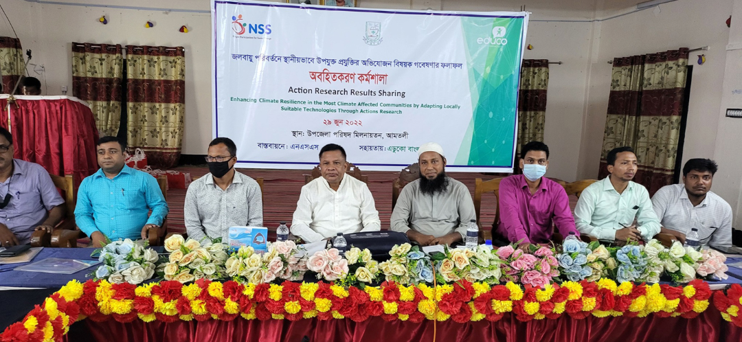 আমতলী প্রতিনিধি।। জয়বায়ূ পরিবর্তনে স্থানীয়ভাবে উপযুক্ত প্রযুক্তি অভিযোজন বিষয়ক গবেষনা ফলাফল অবহিতকরণ কর্মশালা অনুষ্ঠিত হয়েছে। আমতলী উপজেলা পরিষদ মিলনায়তনে বুধবার দুপুরে বে-সরকারী সংস্থা এনএসএস এর আয়োজনে এবং এডুকো বাংলাদেশের সহযোগীতায় এ কর্মশালা অনুষ্ঠিত হয়।