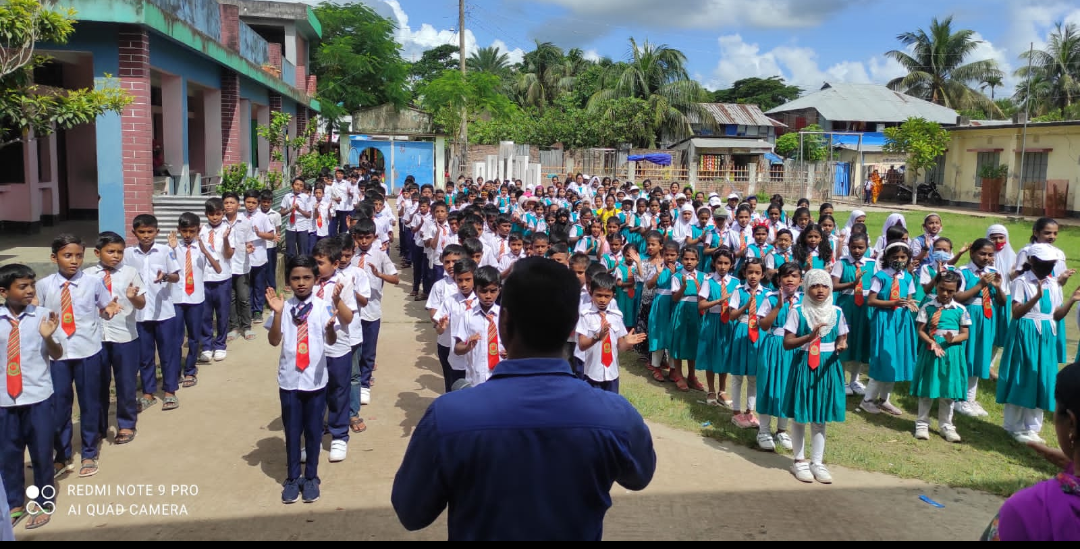 শনিবার (৩০জুলাই) সকাল সোয়া ৯টায় মঙ্গলসুখ মডেল সরকারী প্রাথমিক বিদ্যালয় ক্যাম্পাসে শত শত শিশুরা তাদের প্রাত্যহিক সমাবেশে জাতীয় সঙ্গীত পরিবেশনের পর শত শত কন্ঠে উচ্চারন করলো ’আমি দৃপ্ত কন্ঠে শপথ করছি যে, শহিদদের রক্ত বৃথা যেতে দেবনা। দেশকে ভালোবাসবো, দেশের মানুষের সার্বিক কল্যানে সর্বশক্তি নিয়োগ করবো। জাতির পিতা বঙ্গবন্ধু শেখ মুজিবের আদর্শে উন্নত, সমৃদ্ধ ও অসাম্প্রদায়িক চেতনার সোনার বাংলা গড়ে তুলবো। মহান সৃষ্টিকর্তা আমাকে শক্তি দিন।’ এসময় শত শত শিশুর উচ্ছ্বসিত কন্ঠে চারদিকে প্রকম্পিত হয় সোনার বাংলা গড়ে তোলার দীপ্ত শপথ বাক্যে।