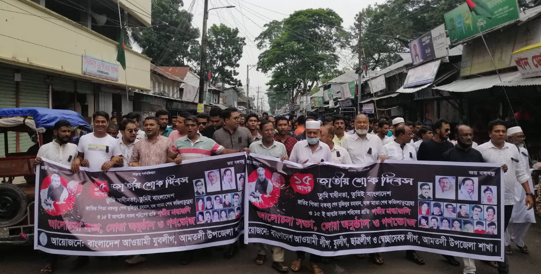 সকাল ৯ টায় পৃথক পৃথক ভাবে উপজেলা আওয়ামীলীগের উদ্যোগে দলীয় কার্যালয় এবং অস্থায়ী কার্যালয়ে জাতীয় শোক দিবসের কর্মসুচী পালন শেষে উপজেলা পরিষদ প্রাঙ্গণে বঙ্গবন্ধু শেখ মুজিবুর রহমানের প্রতিকৃতিতে পুস্পমাল্য অর্পণ করা হয়। এতে উপজেলা আওয়ামীলীগ, যুবলীগ , স্বেচচ্ছাসেবকলীগ, ছাত্রলীগসহ বিভিন্ন অঙ্গ সংগঠন কর্মসুচীতে অংশগ্রহন করেন। জেলা আওয়ামীলীগ সহ-সভাপতি বীর মুক্তিযোদ্ধা অধ্যাপক এসএম শাহজাহান কবিরের নেতৃত্বে উপজেলা আওয়ামীলীগের একটি অংশ শোক র্যালী করে। ইউএনও অফিস প্রাঙ্গণ থেকে র্যালী শুরু হয়ে শহরের প্রধান প্রধান সড়ক প্রদক্ষিণ শেষে আমতলী উপজেলা আওয়ামীলীগ অস্থায়ী কার্যালয় এসএম প্লাজায় আলোচনা সভা অনুষ্ঠিত হয়। সাবেক পৌর আওয়ামীলীগ সভাপতি এ্যাড, বাহাদুর শাহ’র সভাপতিত্বে সভায় বক্তব্য রাখেন বরগুনা জেলা আওয়ামীলীগ সহ-সভাপতি বীর মুক্তিযোদ্ধা এসএম শাহজাহান কবির, উপজেলা আওয়ামীলীগ সহ-সভাপতি সাবেক পৌর মেয়র বীর মুক্তিযোদ্ধা মোঃ নাজমুল আহসান নান্নু, যুগ্ম সাধারণ সম্পাদক গাজী সামসুল হক, উপজেলা দপ্তর সম্পাদক বীর মুক্তিযোদ্ধা আলহাজ্ব মোঃ আনোয়ার হোসেন ফকির, সাংগঠনিক সম্পাদক মোঃ আলমগীর কবির, বশির উদ্দিন তালুকদার, পৌর আওয়ামীলীগ সাধারণ সম্পাদক কাউন্সিলর জিএম মুছা, জেলা যুবলীগ সহ-সভাপতি মোঃ এলমান আহম্মেদ সুহাদ, উপজেলা যুবলীগ সভাপতি জিএম ওসমানী হাসান, সাধারণ সম্পাদক জাহিদ দেওয়ার, যুগ্ম সাধারণ সম্পাদক কেএম তানজিল, উপজেলা স্বেচ্ছাসেবকলীগ সভাপতি মোঃ মোয়াজ্জেম হোসেন খাঁন, সাধারণ সম্পাদক মোঃ জাহিদুল ইসলাম মিঠু মৃধা, পৌর যুবলীগ সভাপতি এ্যাড, আরিফ-উল-হাসান, বীর মুক্তিযোদ্ধা হাবিব হাওলাদার ও আলতাফ হাওলাদার প্রমুখ। অপর দিকে উপজেলা আওয়ামীগ সভাপতি (ভারপ্রাপ্ত) বীর মুক্তিযোদ্ধা এ্যাড. এমএ কাদের মিয়ার সভাপতিত্বে দলীয় কার্যালয়ে আলোচনা সভা অনুষ্ঠিত হয়।