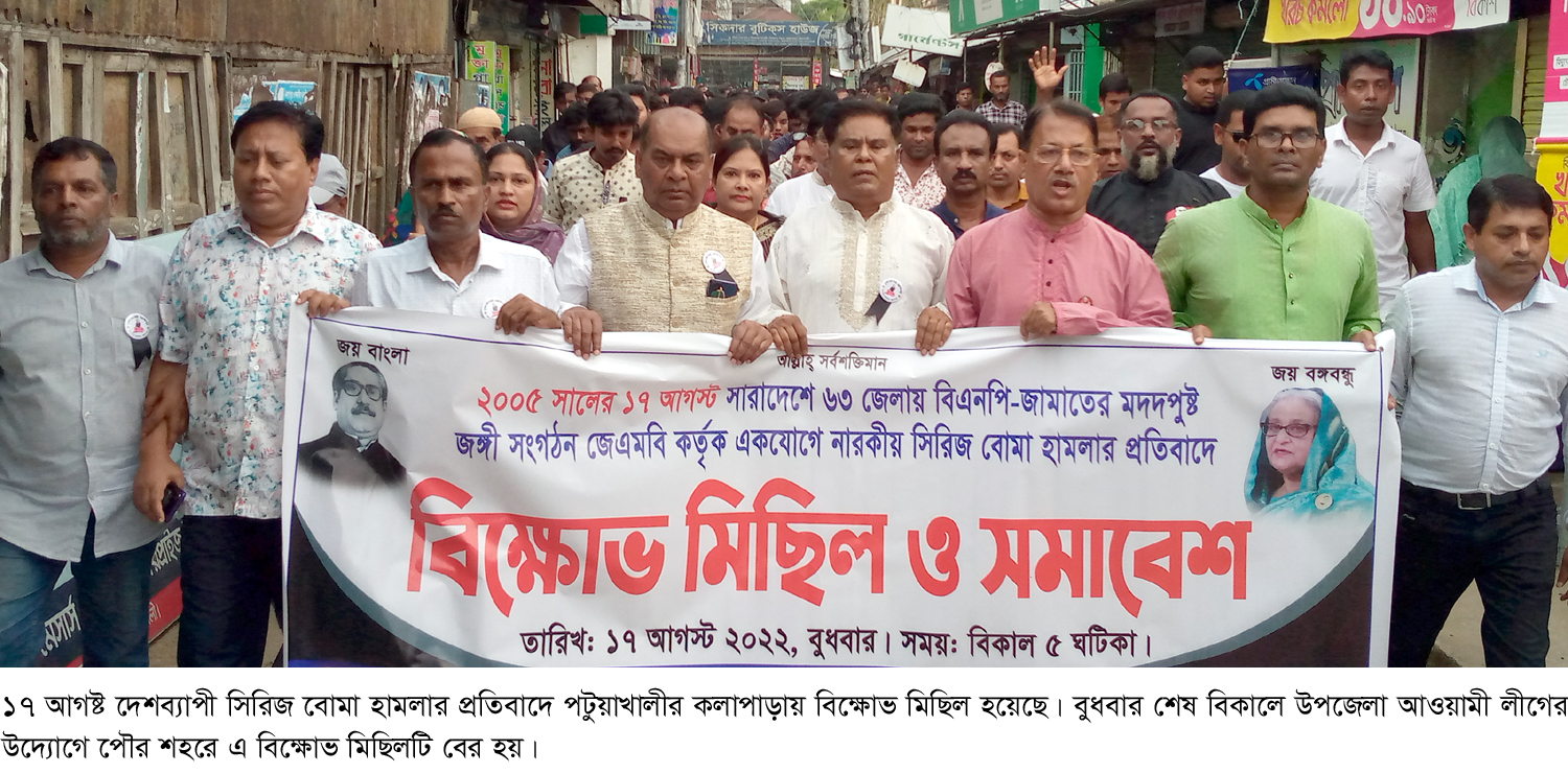 আপন নিউজ অফিস।। ১৭ আগষ্ট দেশব্যাপী সিরিজ বোমা হামলার প্রতিবাদে পটুয়াখালীর কলাপাড়ায় বিক্ষোভ মিছিল হয়েছে। বুধবার শেষ বিকালে উপজেলা আওয়ামী লীগের উদ্যোগে পৌর শহরে এ বিক্ষোভ মিছিলটি বের হয়। এতে উপজেলা আওয়ামী লীগ, যুবলীগ, স্বেচ্ছাসেবক লীগ, কৃষক লীগ, শ্রমিক লীগ, ছাত্রলীগসহ অন্যান্য অঙ্গসংগঠনের নেতাকর্মীরা উপস্থিত ছিলেন।