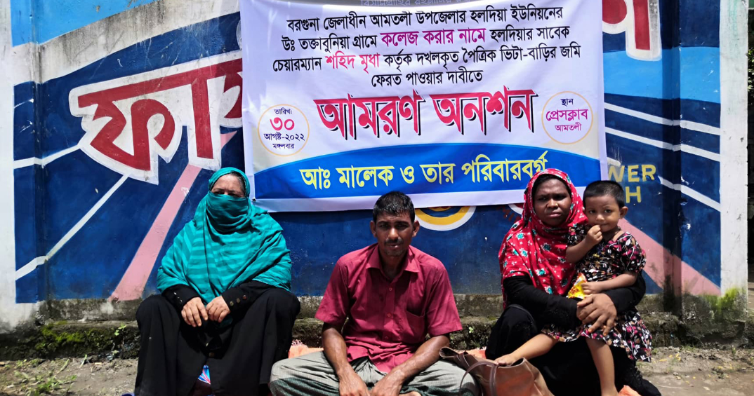 জানাগেছে, উপজেলা উত্তর তক্তাবুনিয়া গ্রামের আলী হোসেন বিশ্বাস ২০০২ সালে ৬০ শতাংশ জমি রেখে মারা যান। তার মৃত্যুতে স্ত্রী মাহিনুর বেগম ও তার ছেলে আব্দুল মালেক বিশ্বাস ওই সম্পত্তির মালিক হন। কিন্তু আব্দুল মালেক বিশ্বাস দীর্ঘদিন ধরে চট্রগ্রাম বসবাস করে আসছেন। ওই সুবাধে হলদিয়া ইউনিয়নের সাবেক চেয়ারম্যান মোঃ শহীদুল ইসলাম মৃধা জাল দলিল করে জোরপূর্বক তার পৈত্রিক ভিটেমাটি ও জমি দখল করে ২০১৯ সালে প্রধানমন্ত্রীর নামে কলেজ প্রতিষ্ঠা করেছেন এমন অভিযোগ ভুক্তভোগী মালেক বিশ্বাসের। ওই পৈত্রিক ভিটা ও জমি ফিরে পাওয়ার দাবীতে মঙ্গলবার আমতলী প্রেসক্লাবের সামনে আব্দুল মালেক বিশ্বাস ও তার মা মাহিনুর বেগম, স্ত্রী কল্পনা বেগম ও এক বছরের শিশু কন্যা ফাহিমাকে নিয়ে আমরণ অনশনে বসেছেন। চেয়ারম্যান শহীদুল ইসলাম মৃধার ভুয়া দলিল তৈরি করে দখলকৃত পৈত্রিক ভিটে মাটি ফিরে পেতে প্রধানমন্ত্রী শেখ হাসিনার সহযোগীতা কামনা করেছেন ওই পরিবার। আমরণ অনশনের দের ঘন্টা পরে দুপুর সাড়ে ১২ টার দিকে উপজেলা পরিষদ চেয়ারম্যান মোঃ মজিবুর রহমানের আশ্বাসে অনশন ভেঙ্গে ফেলা হয়।