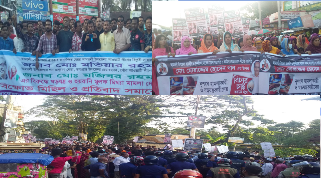 জানাগেছে, গত ১৬ আগষ্ট রাতে উপজেলা স্বেচ্ছাসেবকলীগ সভাপতি মোঃ মোয়াজ্জেম হোসেন খাঁনকে আল হেলাল মোড়ে প্রকাশ্যে জনসম্মুখে উপজেলা ছাত্রলীগ সহ-সভাপতি সবুজ ম্যালাকার, সাংগঠনিক সম্পাদক মোঃ ইসফাক আহম্মেদ তোহা, রাহাত মৃধা, ছাত্রলীগ সদস্য শাহাবুদ্দিন সিহাব ও সন্ত্রাসী রুহুল আমিন ধারালো অস্ত্র দিয়ে এলোপাতারি কুপিয়ে গুরুতর জখম করে। এ ঘটনার ১৬ দিন পর গত ০১ সেপ্টেম্বর মোয়াজ্জেম হোসেন খাঁনের ভাইয়ের ছেলে মোঃ কবির খাঁন বাদী হয়ে আমতলী সিনিয়র জুডিসিয়াল ম্যাজিস্ট্রেট আদালতে উপজেলা ছাত্রলীগ সহ-সভাপতি সবুজ ম্যালকারকে প্রধান আসামী করে উপজলা আওয়ামীলীগ সাধারণ সম্পাদক (ভারপ্রাপ্ত) পৌর মেয়র মোঃ মতিয়ার রহমান, তার বড় ভাই উপজেলা পরিষদ চেয়ারম্যান (ভারপ্রাপ্ত) মোঃ মজিবুর রহমানসহ ৮ জনের নামে হত্যা চেষ্টা মামলা দায়ের করেছেন। পুলিশ গত মঙ্গলবার মামলার দুই নম্বর আসামী মোঃ শাহাবুদ্দিন সিহাবকে গ্রেফতার করেছে। সেচ্ছাসেবকলীগ সভাপতি মোয়াজ্জেম হোসেন খাঁনকে কুপিয়ে জখমের ঘটনার জড়িত আসামীদের গ্রেফতার দাবীকে আমতলী উপজেলা আওয়ামীলীগের একাংশ, যুবলীগ,ছাত্রলীগের একাংশ, স্বেচ্ছাসেবকলীগসহ অঙ্গসংগঠনের কয়েক হাজার নারী পুরুষ নেতাকর্মী বিক্ষোভ মিছিল ও সমাবেশ করেছে। বিক্ষোভ মিছিলটি বাঁধঘাট চৌরাস্তা থেকে শুরু করে আমতলী থানার দক্ষিণ প্রান্তে আসলে পুলিশ ও ডিবি পুলিশ আটকে দেয়। পরে তারা পুরনায় বিক্ষোভ করে আমতলী চৌরাস্তায় এসে সমাবেশ করে। বরগুনা জেলা আওয়ামীলীগ সহ-সভাপতি বীর মুক্তিযোদ্ধা এসএম শাহজাহান কবিরের সভাপতিত্বে সমাবেশে বক্তব্য রাখেন সাবেক পৌর মেয়র বীর মুক্তিযোদ্ধা মোঃ নাজমুল আহসান নান্নু, সাবেক পৌর আওয়ামীলীগ সভাপতি অ্যাড, একেএম বাহাদুর শাহ, দপ্তর সম্পাদক বীর মুক্তিযোদ্ধা মোঃ আনোয়ার হোসেন ফকির, আলহাজ¦ গোলাম সরোয়ার ফোরকান, উপজেলা যুবলীগ সভাপতি জিএম ওসমানী হাসান, পৌর আওয়ামীলীগ সাধারণ সম্পাদক কাউন্সিলর জিএম মুছা, স্বেচ্ছাসেবকলীগ সাধারণ সম্পাদক মোঃ জাহিদুল ইসলাম মিঠু মৃধা, যুবলীগ সাধারণ সম্পাদক মোঃ দেওয়ান জাহিদ ও ছাত্রলীগ নেতা মোঃ লিংকন প্রমুখ।