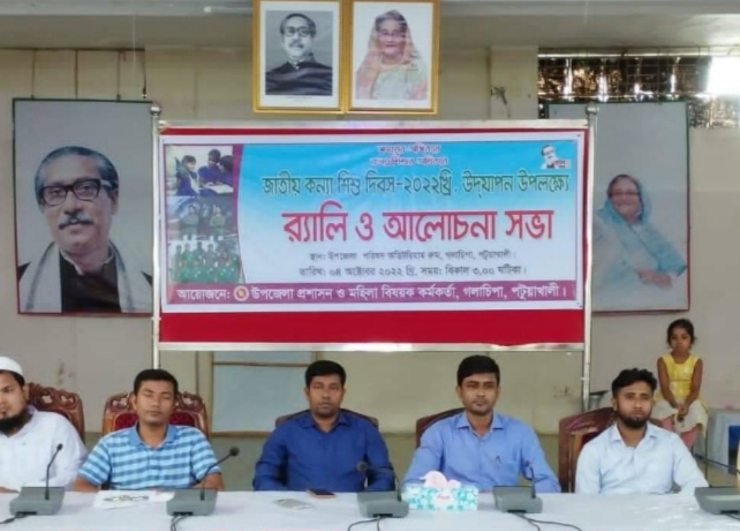 সঞ্জিব দাস, গলাচিপা: "সময়ের অধিকার, কন্যা শিশু ও শিশুর অধিকার" এই প্রতিপাদ্যের আলোকে গলাচিপা উপজেলা প্রশাসন ও মহিলা বিষয়ক অধিদপ্তর আয়োজিত ৪ ঠা অক্টোবর ২০২২ উপজেলা প্রশাসনের পরিষদ হলরুমে বেলা ৩টায় বিভিন্ন সরকারি কর্মকর্তা এনজি প্রতিনিধি, প্রতিষ্ঠানিক নারী সংগঠনের উপস্থিতিতে, এক আলোচনা সভা অনুষ্ঠিত হয়। সভায় সভাপতিত্ব করেন নির্বাহী ম্যাজিস্ট্রেট ও সহকারী কমিশনার ভূমি মোঃ সাইফুল ইসলাম। প্রধান অতিথি হিসেবে বক্তব্য রাখেন উপজেলা সিনিয়র মৎস্য অফিসার মোঃ জহিরুন্নবী, কৃষি সম্প্রসারণ অফিসার, মোঃ আকরামুজ্জামান, পল্লি উন্নয়ন কর্মকর্তা মাহবুব হাসান শিবলী, আনসার ভিডিপি কর্মকর্তা মোঃ সুমন, উপজেলা তথ্য আপা ইসমতারা ও গণশিক্ষা প্রকল্পের ব্যবস্থাপক মোঃ সরোয়ার হোসেন ও মহিলা বিষয়ক দপ্তরের জাকিয়া সুলতানা ও মিতু রানী পাল প্রমুখ। আলোচনা সভায় কন্যা শিশুর সার্বিক বিষয়ে গুরুত্ব নিয়ে বক্তব্য রাখেন প্রেসক্লাব সভাপতি ও কলামিস্ট মু: খালিদ হোসেন মিল্টন। এছাড়া মোসা: রুমা বেগম বক্তব্য দেন। সভায় সভাপতি বলেন, "আজ যে কন্যা শিশু, সে আগামী দিনে নারী। শিশু কন্যাদের সকল পর্যায়ে, সুরক্ষা ও অধিকার প্রতিষ্ঠায় সকলকে, নিজ পরিবার থেকে রাষ্ট্রীয়ভাবে গুরুত্ব প্রদানের আহ্বান জানান। সভা শেষে, এক দেশী মিছিল বের করে।
