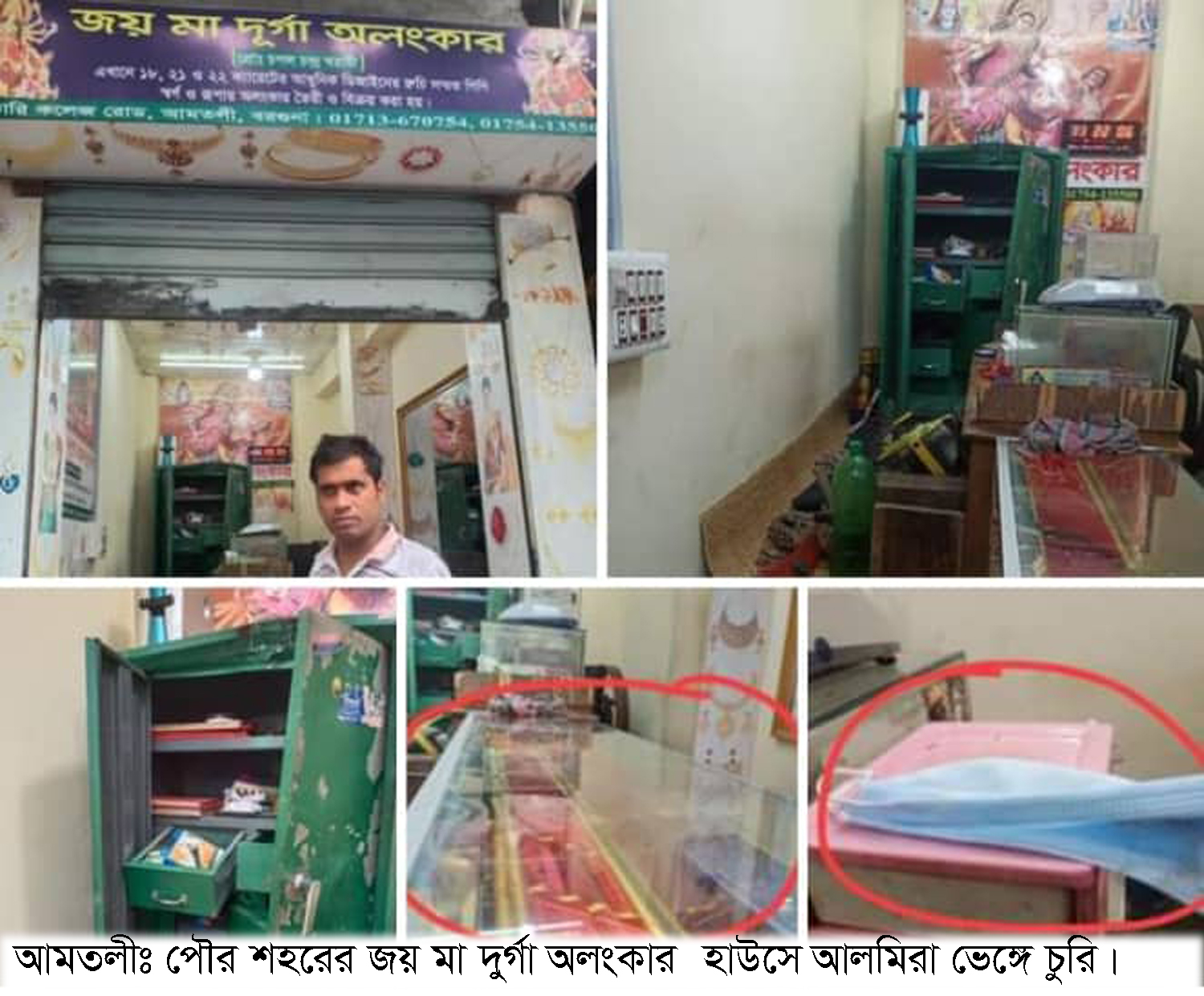 জয় মা দুর্গা অলংকার হাউসের মালিক চপল চন্দ্র ঘরামী বলেন, চোর চক্র দোকানের আলমিরা ভেঙ্গে পাঁচ ভরি স্বর্নাংলকার ও নগদ এক লক্ষ ১৫ হাজার টাকা চুরি করে নিয়ে গেছে।