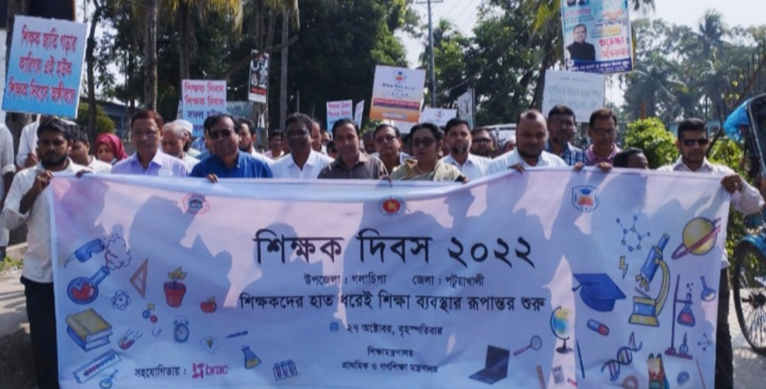 সঞ্জিব দাস,গলাচিপা: শিক্ষক হল আলোর পথিক, শিক্ষক ছাড়া- শিক্ষামূল্যহীন। শিক্ষকের হাত ধরেই, শিক্ষা ব্যবস্থার রূপান্তর শুরু হয়। এই শ্লোগানে, বর্তমান শেখ হাসিনা সরকার ও শিক্ষা মন্ত্রণালয়, দেশের সকল শিক্ষকদের রাষ্ট্রীয়ভাবে সম্মান মর্যাদা প্রতিষ্ঠার লক্ষে সারা দেশের ন্যায় গলাচিপা মাধ্যমিক শিক্ষা অধিদপ্তরের আয়োজনে এবং বেসরকারি সংস্থা ব্রাক এর সহযোগিতায় বৃহস্পতিবার সকাল ১০ টায় উপজেলা কমপ্লেক্স থেকে ছাত্র-ছাত্রীদের ব্যান্ড, ব্যানারসহ উপজেলার সকল শিক্ষকদের নিয়ে এক বর্ণাঢ্য র্যালী মিছিল বের করে। র্যালীটি শহর ঘুরে উপজেলা পরিষদ হল রুমে শেষ হয়, গলাচিপা সরকারি ডিগ্রী কলেজের অধ্যক্ষ ফোরকান কবির এর সভাপতিত্বে আলোচনা সভা অনুষ্ঠিত হয়।