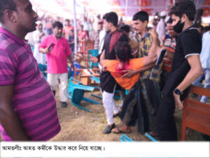 আমতলী প্রতিনিধি: আমতলী উপজেলা আওয়ামীলীগ ত্রি-বার্ষিক সম্মেলনে কেন্দ্রীয় নেতাদের সামনে দুই গ্রুপের ধাওয়া পাল্টা ধাওয়া ও মারধরের ঘটনা ঘটেছে । দুই গ্রুপের হামলায় অন্তত ৫০ জন আহত হয়েছে। আহতদের আমতলী ও বরিশাল শেবাচিম হাসপাতালে প্রেরন করা হয়েছে। ঘটনা ঘটেছে বরিবার দুপুর দের টার দিকে।