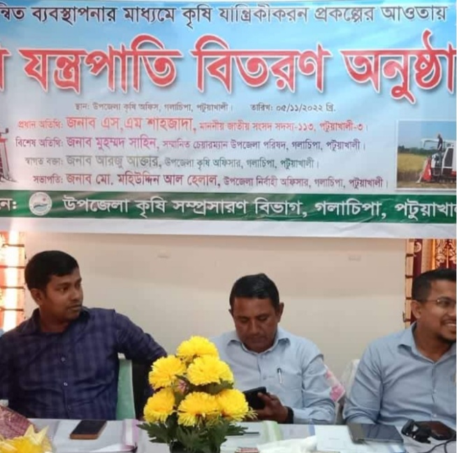 গলাচিপা উপজেলা প্রশাসন ও কৃষি সম্প্রসারণ বিভাগের আয়োজনে, উপজেলার চলতি বছরের বরাদ্দকৃত ১৮ টি কম্বাইন্ড হারভেস্টারের ৫ টি, সিডার ১৫ টি, রাইস প্লান্টার ২টি ও রিপার ১টি বিতরণের শুভ উদ্বোধনীতে এমপি হোস্টেল থেকে ভিডিও কনফারেন্স সভায় প্রধান অতিথি হিসেবে পটুয়াখালী-১১৩ (৩) গলাচিপা-দশমিনা এলাকার এস এম শাহজাদা এমপি একথা বলেন।
