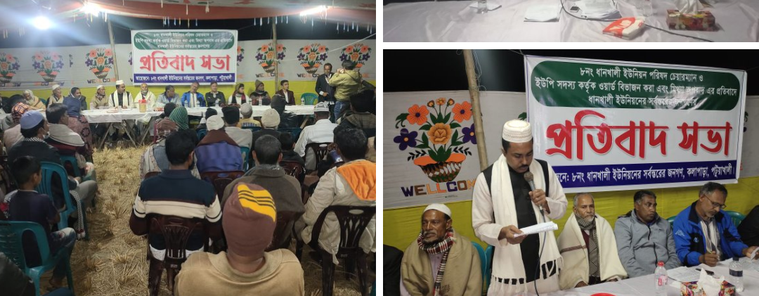 আপন নিউজ অফিস: ২০২৩ সালের মার্চে অনুষ্ঠিত হওয়ার কথা পটুয়াখালীর কলাপাড়া উপজেলার ধানখালী ইউনিয়ন পরিষদ নির্বাচন। কিন্তু নির্বাচন বানচাল করতে ওই ইউনিয়নের ৭,৮,৯ এবং ২,৪ ও ৬ নং ওয়ার্ডকে বিভাজন করার লক্ষে স্থানীয় সরকার প্রকৌশল অধিদপ্তর পটুয়াখালীর উপপরিচালক বরাবরে আবেদন করেছে ইউনিয়ন পরিষদ। গত ২৪ আগষ্ট ইউনিয়ন পরিষদ চেয়ারম্যান রিয়াজ তালুকদার এ আবদেন করেন। ওই আবেদনে উল্লেখ করা হয় ৭,৮,৯ এর কৃষি জমি সহ সকল স্থাপনা এবং ২,৪, ৬ নং ওয়ার্ডের জমি ঘর আংশিক অধিগ্রহন করা হয়। অধিগ্রহনকৃত গ্রামের সকল অধিবাসীকে সরকারী আবাসনে অন্যত্র পুর্নবাসিত করা হয়েছে। যাহা পর্বের ওয়ার্ড বা গ্রামের মধ্যে। এসব ভুল্য তথ্য দিয়ে স্থানীয় সরকার প্রকৌশল অফিসে আবদেন করায় ফুসে ওঠে স্থানীয় জনগন। মঙ্গলবার সন্ধ্যায় এঘটনার প্রতিবাদ জানিয়ে আনন্দ বাজার এলাকায় প্রতিবাদ সভা করে স্থানীয় হজারো মানুষ। এসময় বক্তব্য রাখেন ধানখালী ইউনিয়ন আওয়ামীলীগের সভাপতি শাহাজাদ পারভেজ টিনু মৃধা, সাধারন সম্পাদক জাকির মৃধা, মুক্তিযোদ্ধা আবদুর রব, ধানখালী ইউনিয়ন ইসলামী আন্দোলনের সভাপতি দলিল উদ্দিন মাতবর ও ৪ নং ওয়ার্ড বিএনপির স়ভাপতি আবুল হাওলাদার।