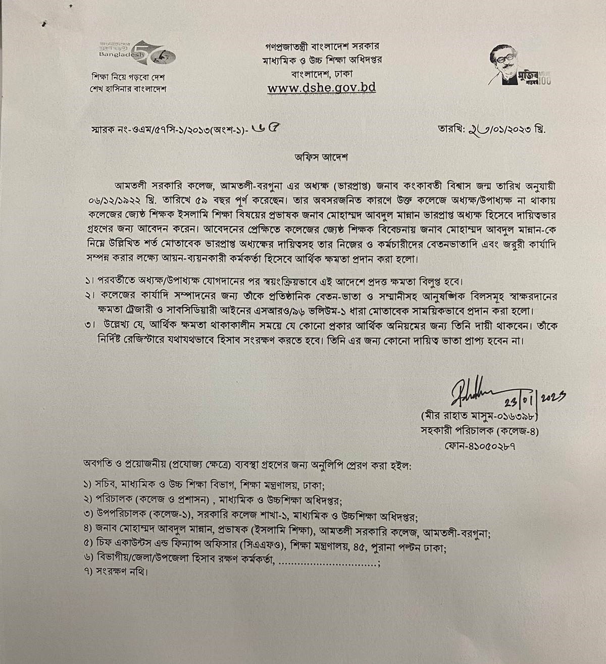 আমতলী সরকারী কলেজের অধ্যক্ষ (ভারপ্রাপ্ত) মোহাম্মদ আব্দুল মান্নান বলেন, মাধ্যমিক ও উচ্চ শিক্ষা অধিদপ্তরের অফিস আদেশ পেয়েছি। তাতে আমাকে কলেজের ভারপ্রাপ্ত অধ্যক্ষের দায়িত্ব দেয়া হয়েছে। ওই অফিস আদেশে উল্লেখ আছে যততিন পর্যন্ত কলেজে অধ্যক্ষ দেয়া না হবে ততদিন কলেজের অধ্যক্ষের দায়িত্ব আমাকে পালন করতে হবে। তিনি আরো বলেন, ওই অফিস আদেশ মতে আমি সোমবার বিকেল ভারপ্রাপ্ত অধ্যক্ষ পদের দায়িত্ব গ্রহন করেছি।