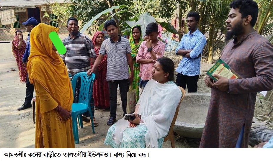 আমতলী প্রতিনিধি: তালতলীতে বরযাত্রী আসার আগেই কনের বাড়ীতে ইউএনও সিফাত আনোয়ার টুম্পা উপস্থিত হয়ে বাল্য বিয়ে বন্ধ করে দিয়েছেন। ঘটনা ঘটেছে শুক্রবার দুপুরে তালতলী উপজেলার শিকারীপাড়া গ্রামে। এ ঘটনার এলাকায় চাঞ্চল্যের সৃষ্টি হয়েছে।