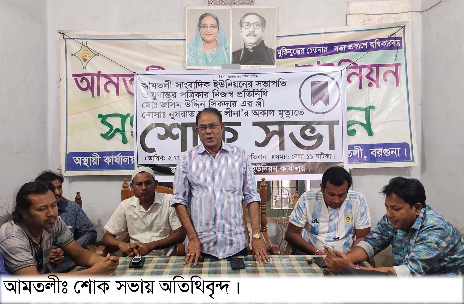আমতলী প্রতিনিধিঃ দৈনিক যুগান্তর পত্রিকার স্টাফ রিপোর্টার আমতলী সাংবাদিক ইউনিয়ন সভাপতি মোঃ জসিম উদ্দিন সিকদারের স্ত্রী সাবেক ইউপি সদস্য নুসরাত জাহান লীনার অকাল মৃত্যুতে আমতলী সাংবাদিক ইউনিয়নের উদ্যোগে শোকসভা অনুষ্ঠিত হয়েছে। বৃহস্পতিবার দুপুরে সাংবাদিক ইউনিয়ন কার্যালয়ে এ সভা অনুষ্ঠিত হয়।