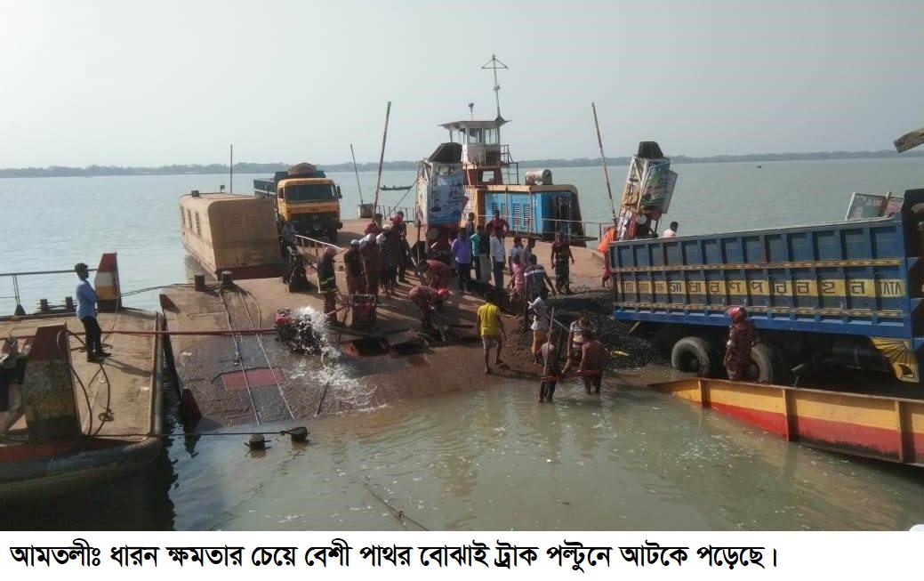 জানাগেছে, বরগুনা পৌরসভার সাবেক মেয়র মোঃ শাহাদত হোসেনের একটি ট্রাক ধারন ক্ষমতার চেয়ে পাথর বোঝাই করে পায়রা তাপবিদ্যুৎ কেন্দ্রে যেতে পুরাকাটা পল্টুন থেকে ফেরিতে ওঠে। দুপুর দেরটার দিকে পুরাকাটা পল্টুন থেকে ফেরি ছেড়ে আসে। পায়রা নদী পাড়ি দিয়ে আধা ঘন্টা পরে ফেরি আমতলী পল্টুনে নোঙ্গর করে। ওই সময় ফেরি থেকে পল্টুনে ট্রাক ওঠা মাত্রই ট্রাক আটকে পল্টুন দেবে যায় এবং পল্টুনে পানি উঠতে শুরু করে।