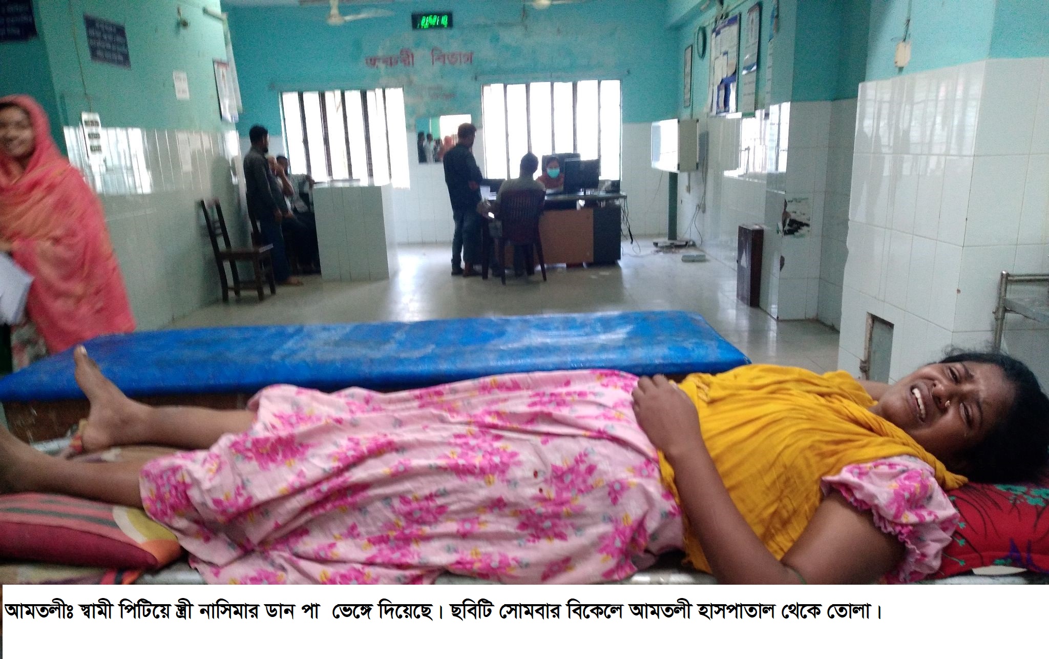 জানাগেছে, ২০১৪ সালে উপজেলার নাচনাপাড়া গ্রামের ফারুক পাহলানের কন্যা নাসিমাকে কাউনিয়া গ্রামের ইউসুফ ফকিরের (২৮) কাছে বিয়ে দেয়। বিয়ের পর থেকে বিভিন্ন অযুহাতে স্ত্রী নাসিমাকে স্বামী ইউসুফ ফকির নির্যাতন করে আসছে। সোমবার দুপুরে প্রতিবেশীর সাথে তার সখ্যতা রয়েছে এমন মিথ্যা অপবাধ দিয়ে স্ত্রী নাসিমাকে স্বামী ইউসুফ ফকির পিটিয়ে গুরুতর জখম করে। এতে তার ডান পা ভেঙ্গে যায়। খবর পেয়ে স্বজনরা তাকে উদ্ধার করে আমতলী উপজেলা স্বাস্থ্য কমপ্লেক্সে নিয়ে আসে। ওই হাসপাতালের কর্তব্যরত চিকিৎসক ডাঃ লুনা বিনতে হক ওইদিন বিকেলে তাকে উন্নত চিকিৎসার জন্য বরিশাল শেবাচিম হাসপাতালে প্রেরন করেছে।