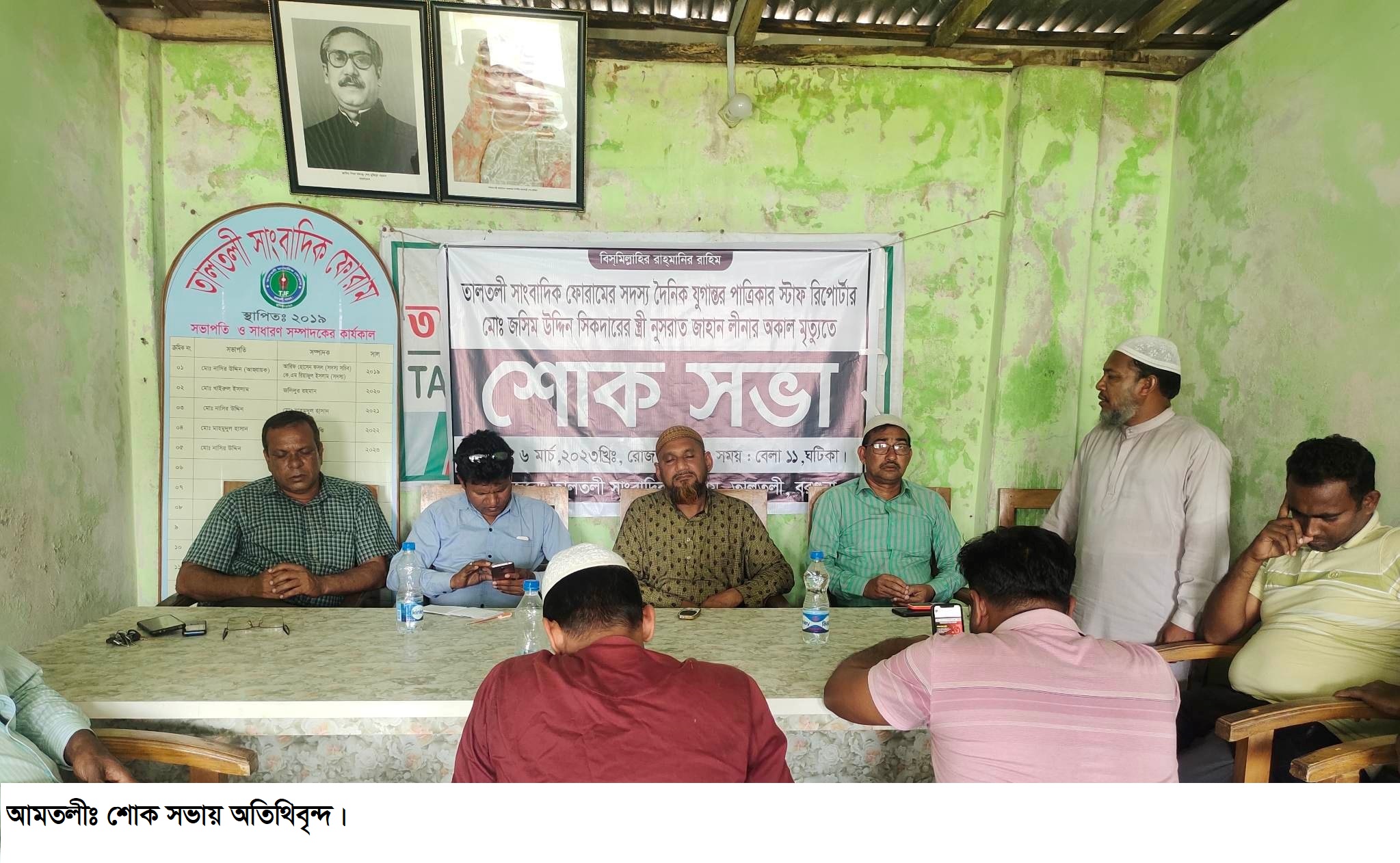 তালতলী সাংবাদিক ফোরামের সভাপতি মোঃ নাশির উদ্দিনের সভাপতিত্বে শোকসভায় প্রধান অতিথি ছিলেন বাংলাদেশ মানবাধিকার কমিশন তালতলী উপজেলা শাখার সাধারণ সম্পাদক ইউপি সদস্য মোঃ নজরুল ইসলাম লিটু। বিশেষ অতিথি ছিলেন বরগুনা জেলা যুবলীগ ধর্ম বিষয়ক সম্পাদক মোঃ ইমতিয়াজ ইমন নয়ন, তালতলী প্রেসক্লাব সভাপতি মুহা. আব্দুল মোতালেব, রিপোটার্স ইউনিটির সভাপতি মাওলানা মোঃ জোবায়ের হোসেন ও সাংবাদিক ইউনিয়ন সভাপতি মাওলানা মোঃ ইউসুফ আলী।