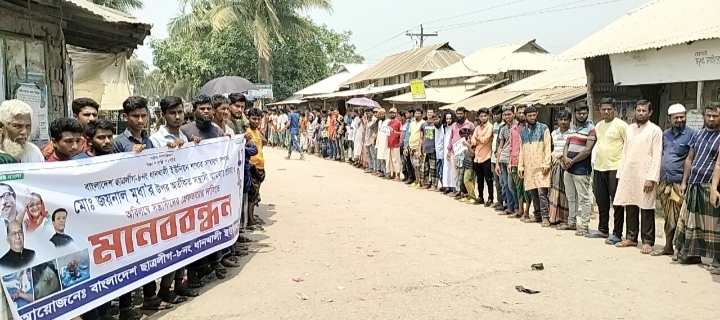 আপন নিউজ অফিসঃ কলাপাড়া উপজেলার ধানখালী ইউনিয়ন ছাত্রলীগের সাধারণ সম্পাদক জয়নাল মৃধা ও আওয়ামী লীগ নেতা বারেক চৌকিদারকে বেধড়ক কুপিয়ে জখম করার ঘটনায় জড়িত সশস্ত্র সন্ত্রাসীদের গ্রেপ্তারের দাবিতে সোমবার বেলা ১১টায় কলেজ বাজারে শত শত মানুষ মানববন্ধন করেছে।