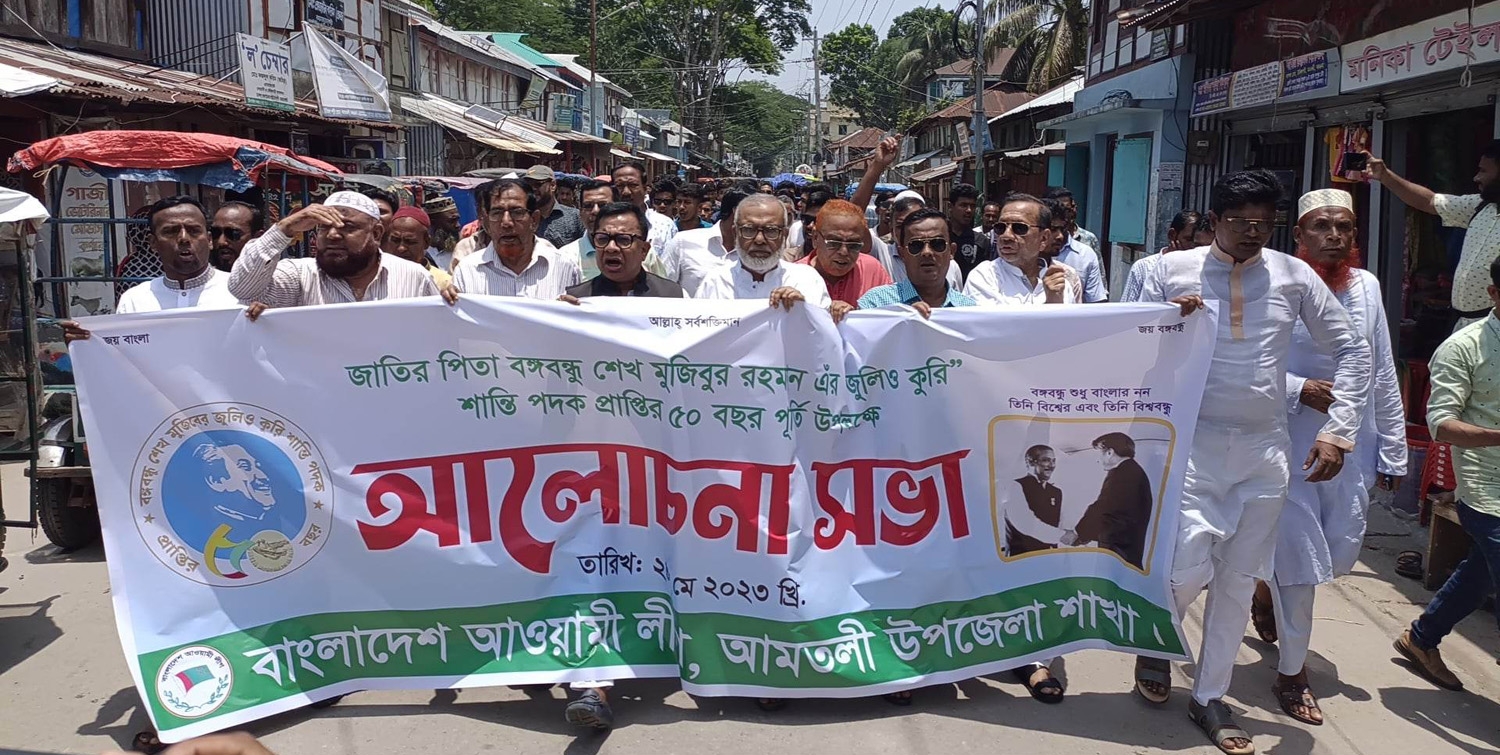 আমতলী প্রতিনিধিঃ আমতলী উপজেলা প্রশাসনের উদ্যোগে জাতীর জনক বঙ্গবন্ধু শেখ মুজিবুর রহমানের জুলি ও কুরি শান্তি পদক প্রাপ্তির ৫০ বছর পুর্তি বরিবার বিভিন্ন কর্মসুচীর মধ্যদিয়ে উদযাপন করা হয়েছে। কর্মসুচীর মধ্য ছিল বঙ্গবন্ধুর প্রতিকৃতিতে পুস্পস্তবক অর্পণম র্যালী ও আলোচনা সভা।