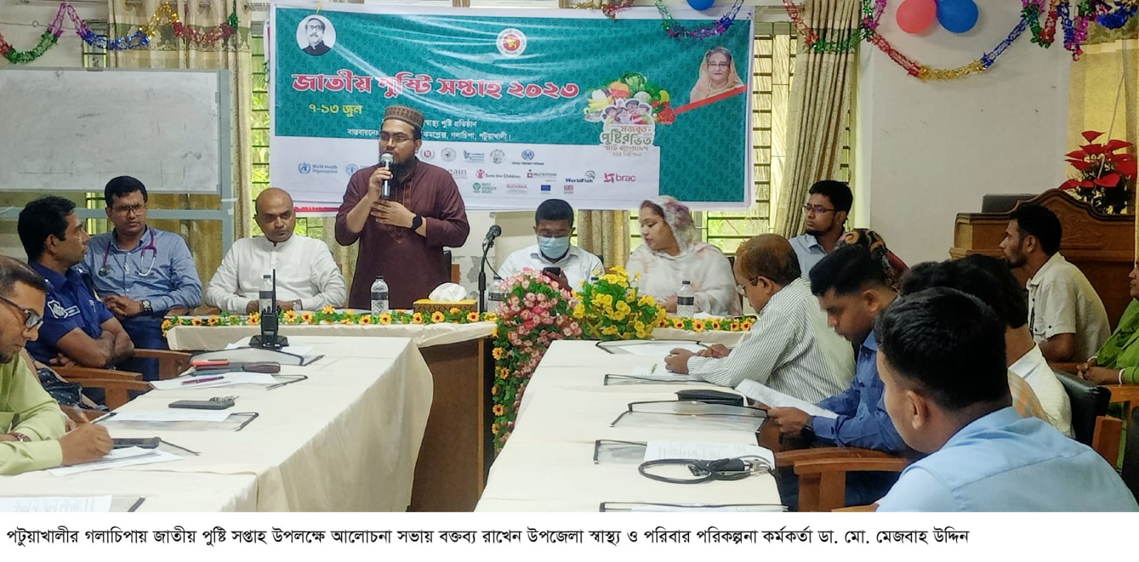 সঞ্জিব দাস,গলাচিপাঃ গলাচিপায় উপজেলা স্বাস্থ্য ও পরিবার পরিকল্পনা দপ্তরের আয়োজনে বিভিন্ন কর্মসূচির মধ্য দিয়ে জাতীয় পুষ্টি সপ্তাহ-২০২৩ উদযাপিত হয়েছে। এ উপলক্ষে বুধবার (৭ জুন) সকাল ১০টায় উপজেলা স্বাস্থ্য কমপ্লেক্সের কনফারেন্স রুমে এক আলোচনা সভা অনুষ্ঠিত হয়। উপজেলা নির্বাহী অফিসার মো. মহিউদ্দিন আল হেলালের সভাপতিত্বে এবং ডা. মো. তরিকুল ইসলামের সঞ্চালনায় সভায় মুখ্য আলোচক হিসেবে বক্তব্য রাখেন উপজেলা স্বাস্থ্য ও পরিবার পরিকল্পনা কর্মকর্তা ডা. মো. মেজবাহ উদ্দিন। অন্যান্যের মধ্যে বক্তব্য রাখেন উপজেলা পরিষদের মহিলা ভাইস চেয়ারম্যান ওয়ানা মার্জিয়া নিতু, উপজেলা কৃষি কর্মকর্তা আরজু আক্তার, উপজেলা সিনিয়র মৎস্য কর্মকর্তা মো. জহিরুন্নবী, উপজেলা পরিবার পরিকল্পনা কর্মকর্তা ডা. মো. ইলিয়াস খান রানা, উপজেলা শিক্ষা অফিসার মীর রেজাউল ইসলাম, গলাচিপা থানার সেকেন্ড অফিসার এসআই মো. মহসিন হাওলাদার, চিকনিকান্দি ইউপি চেয়ারম্যান সাজ্জাদ হোসেন রিয়াদ, গলাচিপা প্রেস ক্লাব সভাপতি সমিত কুমার দত্ত মলয়, ওয়েব ফাউন্ডেশনের সমন্বয়ক মো. শরীফুল ইসলাম প্রমুখ।
