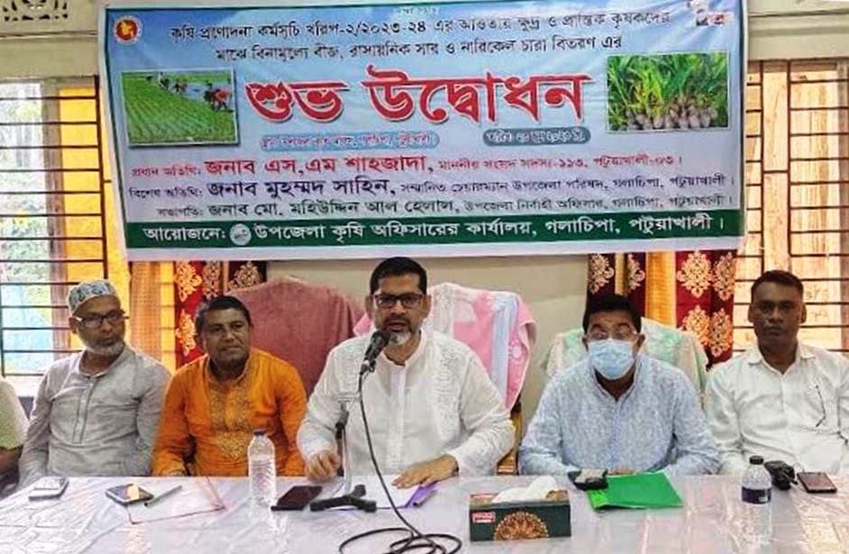সঞ্জিব দাস, গলাচিপাঃ গলাচিপা উপজেলা কৃষি অফিসের আয়োজনে কৃষি প্রণোদনা কর্মসূচি খরিপ-২/২০২৩-২৪ এর আওতায় ক্ষুদ্র ও প্রান্তিক কৃষকদের মাঝে বিনামূল্যে বীজ, রাসায়নিক সার ও নারিকেল চারা বিতরণ অনুষ্ঠানের শুভ উদ্বোধন করা হয়েছে। শুক্রবার (২৩ জুন) বেলা সাড়ে ১১টায় উপজেলা কৃষি অফিস কার্যালয়ে উপজেলা নির্বাহী অফিসার মো. মহিউদ্দিন আল হেলালের সভাপতিত্বে অনুষ্ঠানের উদ্বোধন করেন প্রধান অতিথি পটুয়াখালী-৩ গলাচিপা-দশমিনা আসনের জাতীয় সংসদ সদস্য এসএম শাহজাদা। বিশেষ অতিথি হিসেবে উপস্থিত ছিলেন উপজেলা পরিষদ চেয়ারম্যান মুহম্মদ সাহিন। অনুষ্ঠানে মুখ্য আলোচক হিসেবে বক্তব্য রাখেন উপজেলা কৃষি কর্মকর্তা আরজু আক্তার।