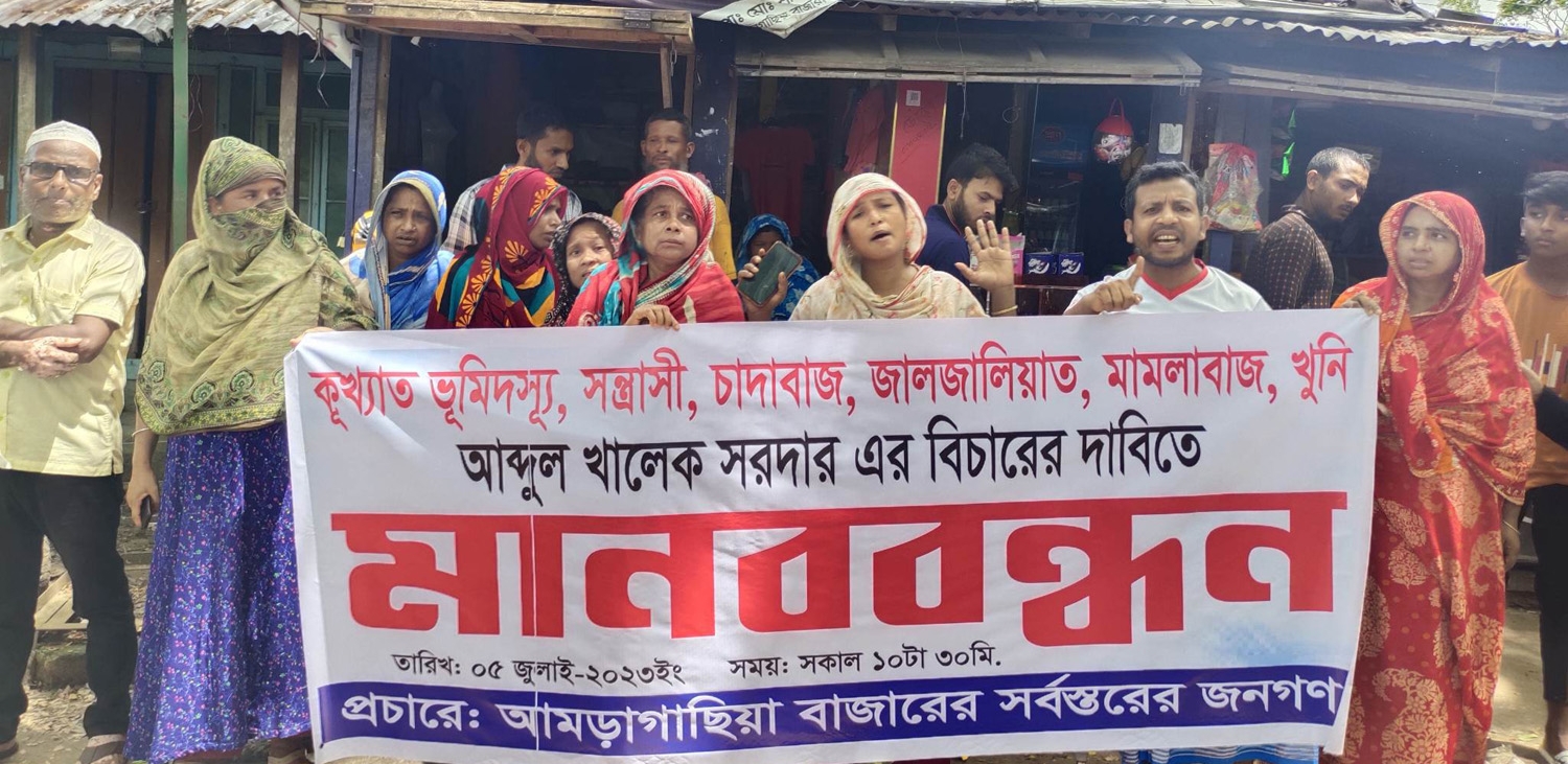 মানববন্ধনে খালেক সরদারের মেয়ে রাহিমা বেগম বলেন, আমারা বাবা এলাকা চিহিৃত ভুমি দস্যু। তিনি পানি উন্নয়ন বোর্ডের কয়েক একর জমি জাল জালিয়াতির মাধ্যমে জোরপুর্বক দখল করে আসছে। তার কারনে এলাকার মানুষ অতিষ্ঠ। জমির জন্য আমার বাবা তার আপন ভাইয়ের ছেলে কালামিয়া সরদারকে হত্যা করেছে। ওই মামলার বেশ কয়েক বছর জেল হাজতে ছিলেন। আমড়াগাছিয়া বাজারের কেউ জমি বিক্রি করলে তাকে চাঁদা দিতে হয়, নইলে তিনি জমি বিক্রি করতে দেন না। জমি নিয়ে এলাকার অন্তত শতাধিক মানুষকে মিথ্যা মামলা দিয়ে হয়রানী করছে। আমার শ্বশুর বাড়ীর জমি জোরপূর্বক গত ২০ বছর ধরে ভোগদখল করছে। আমার স্বামী নাশির খলিফা ও আমি এর প্রতিবাদ করায় আমাদের বিরুদ্ধে বাবা ৪৭ টি মিথ্যা মামলা দিয়েছে। আমি আমার বাবার এমন অপকর্মের বিচার চাই।