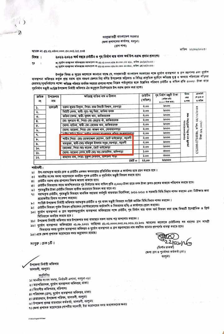 তালিকায় ক্ষতিগ্রস্থ ১২ পরিবারের মধ্যে তালতলী উপজেলা মানবাধিকার কমিশন সাধারণ সম্পাদক ছোটভাই জোড়া ছালেহিয়া আলিম মাদ্রাসার জুনিয়র মৌলুভী ও দৈনিক যুগান্তর পত্রিকার তালতলী প্রতিনিধি মুহাঃ আব্দুল মোতালিব ভুয়া অগ্নিকান্ডে ক্ষতিগ্রস্থ দেখিয়ে তার স্ত্রী মাজেদা বেগম, মেয়ে মাহফুজা,শালিকা রোকেয়া ও শালিকার ছেলে শাহীনের নামে ঢেউটিন ও টাকা বরাদ্ধ করেছেন। ওই চার নামে ৭ বান্ডিল ঢেউটিন ও ২১ হাজার টাকা তুলে আত্মসাৎ করেছে তিনি।