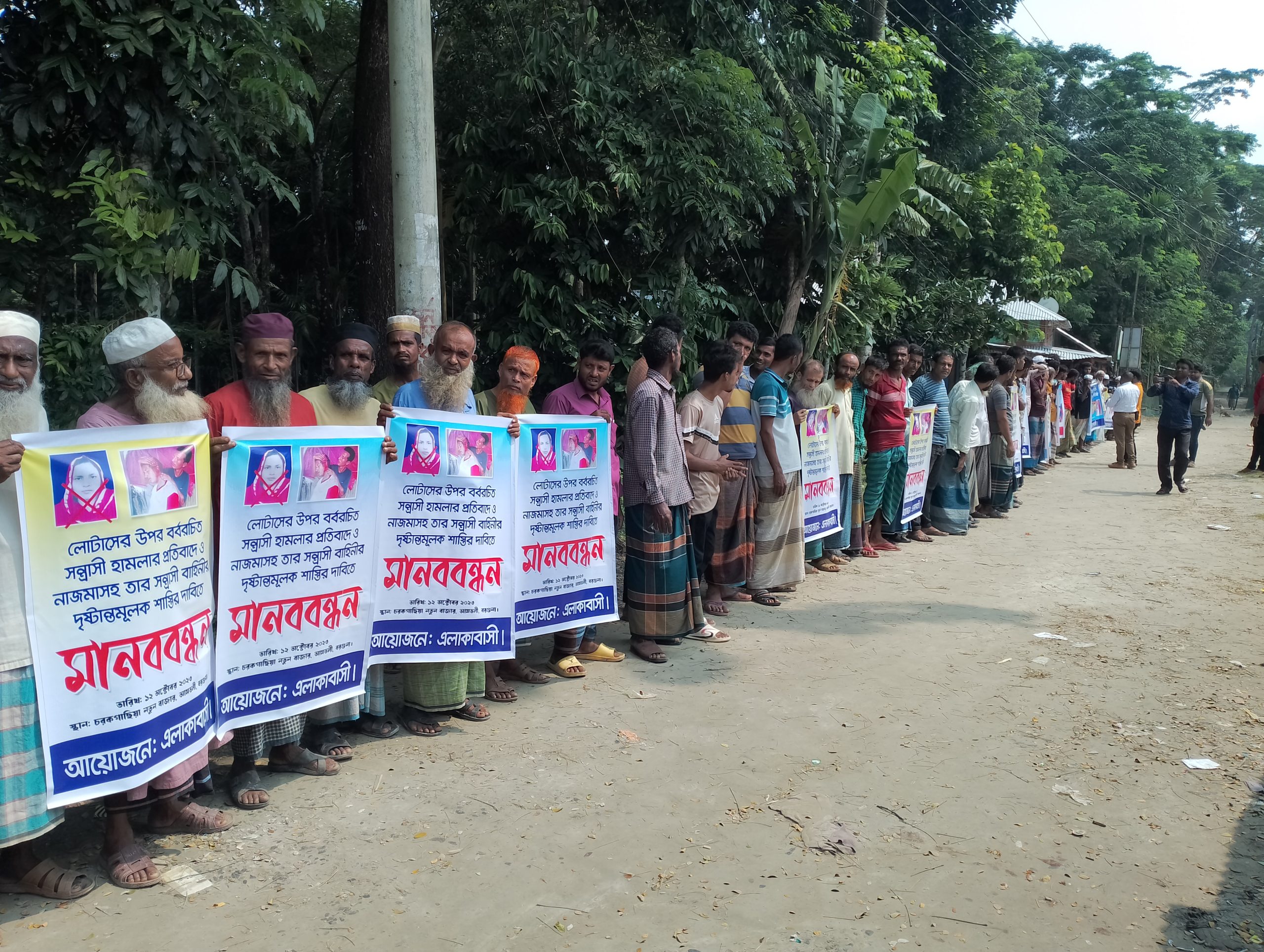 জানাগেছে, উপজেলার চরকগাছিয়া গ্রামের লোটাস হাওলাদারের দশম শ্রেনীতে পড়ুয়া কন্যাকে একই এলাকার নাজমা বেগমের বখাটে ছেলে নাজমুল মোল্লা বিদ্যালয়ে আসা যাওয়ার পথে উত্যাক্ত করে আসছিল। গত ২৩ সেপ্টেম্বর ছাত্রীর বাবা লোটাস হাওলাদার এর প্রতিবাদ করেন। এতে ক্ষিপ্ত হয়ে স্কুল ছাত্রীর বাবাকে বখাটে নাজমুল, তার মা নাজমা বেগম ও তার সহযোগীরা পিটিয়ে গুরুতর জখম করে। তাকে পিটিয়েই খ্যান্ত হয়নি তারা, উল্টো স্কুল ছাত্রীর বাবা লোটাস হাওলাদারের বিরুদ্ধে মিথ্যা মামলা দায়ের করেন নাজমুলের মা নাজমা বেগম। এ মিথ্যা মামলা প্রত্যাহার এবং বখাটে নাজমুলের শাস্তির দাবীতে বৃহস্পতিবার এলাকাবাসী মানববন্ধন করেছে। চরকগাছিয়া বাজারের ঘন্টাব্যাপী মানববন্ধনে বক্তব্য রাখেন আব্দুল জব্বার তালুকদার, আহসান মোল্লা, আবু কালাম মিয়া, রিমন সিকদার ও কামাল নাগর প্রমুখ।