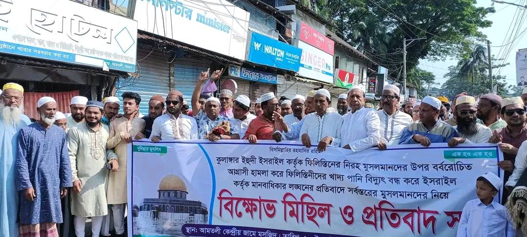 আমতলী প্রতিনিধিঃ কুলাঙ্গর ইহুদি ইসরাইল কর্তৃক ফিলিস্তিনের নিরহ মুসলমানদের ওপর বর্বরোচিত অগ্রাসী হামলা ও খাদ্য পানি বিদ্যুৎ বন্ধ করে দেয়ার প্রতিবাদে আমতলীতে শুক্রবার জুমআর নামাজ শেষে বিক্ষোভ মিছিল হয়েছে।