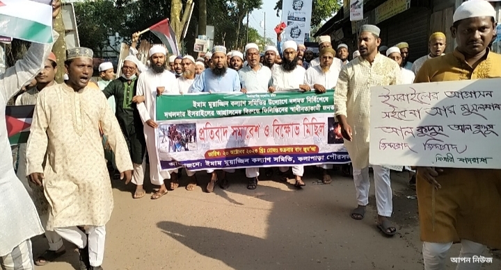 আপন নিউজ অফিসঃ কলাপাড়ায় ইসরাইলি হামলার প্রতিবাদে বিক্ষোভ মিছিল ও সমাবেশ অনুষ্ঠিত হয়েছে। ইমাম মুয়াজ্জিন কল্যান সমিতির উদ্যোগ ও আয়োজনে শুক্রবার(২০ অক্টোবর) জুমা নামাজ বাদ কলাপাড়া কেন্দ্রীয় জামে মসজিদ থেকে একটি বিক্ষোভ মিছিল বের হয়। মিছিলটি পৌরশহরের প্রধান প্রধান সড়ক প্রদক্ষিণ করে মসজিদ মাঠে এসে এক প্রতিবাদ সভায় মিলিত হয়।