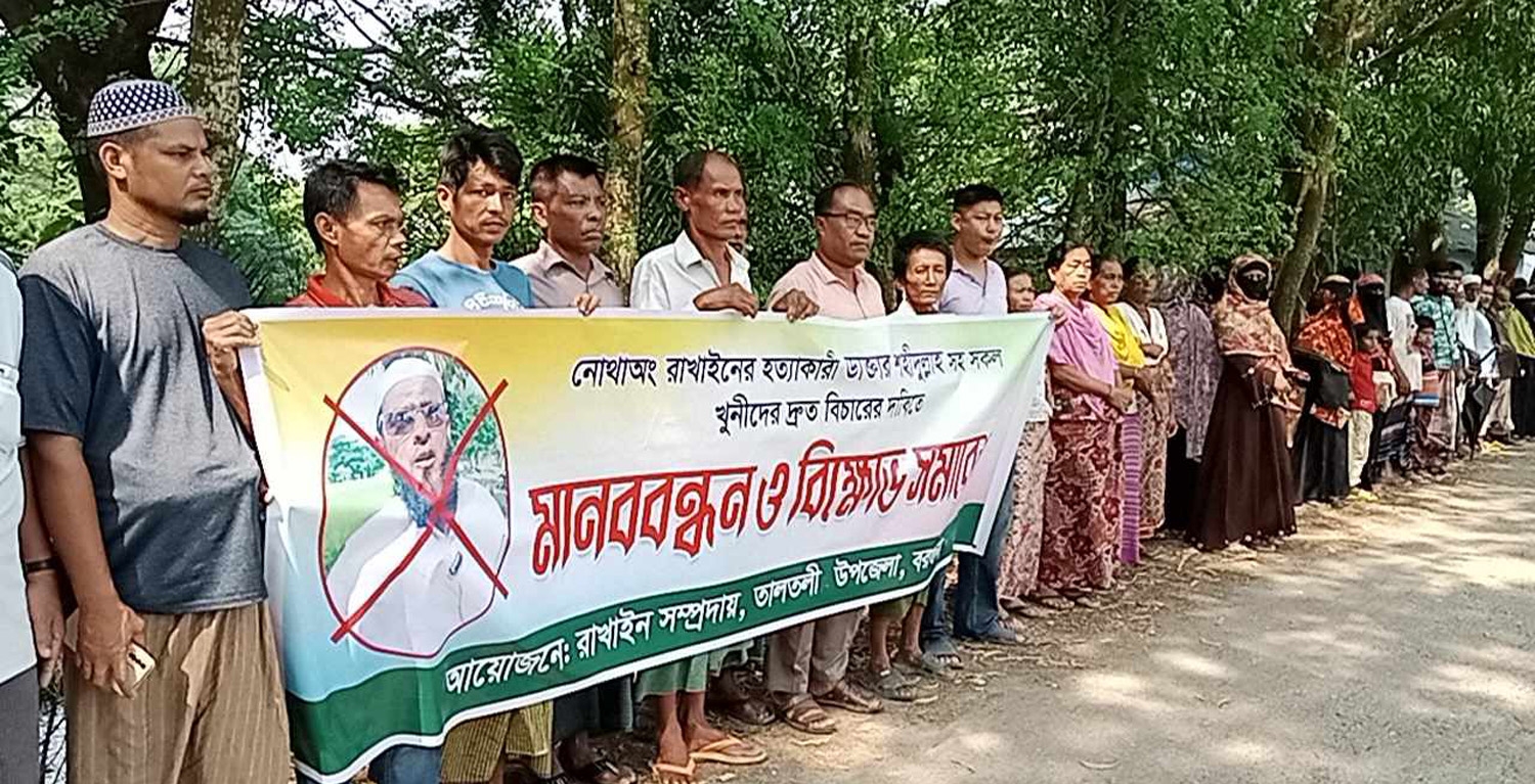 মামলা সুত্রে জানাগেছে, ২০১৭ সালের ২২ জুন তালতলী উপজেলার নামিশেপাড়া থেকে রাখাইন বৃদ্ধ নোথাঅং তালুকদারের গলাকাটা লাশ উদ্ধার করে পুলিশ। ঘটনার দুইদিন পরে ২৪ জুন তাঁর আত্মীয় জোওয়েন বাদী হয়ে শহীদুল ডাক্তারসহ চারজনের নাম উল্লেখ করে তালতলী থানায় হত্যা মামলা দায়ের করেন। এ মামলাটি অতিকতর তদন্ত করে প্রতিবেদন দাখিলের জন্য বরগুনা সিআইডি পুলিশের কাজে ন্যস্ত করা হয়। কিন্তু ঘটনার ছয় বছর পেরিয়ে গেলেও সিআইডি পুলিশ এখনো চুড়ান্ত প্রতিবেদন আদালতে দাখিল করেনি। এতে ওই এলাকার রাখাইন জনগোষ্ঠির মধ্যে ক্ষোভ বিরাজ করছে। শনিবার বেলা ১১ টার দিকে রাখাইন জনগোষ্ঠির উদ্যোগে এ ঘটনার সঙ্গে জড়িত শহীদুল ডাক্তারসহ সকল আসামীদের গ্রেপ্তার ও বিচার দাবীতে মানববন্ধন করা হয়।তাতিপাড়া বাজারে রাখাইন সমাজ উন্নয়ন সংস্থার সাধারণ সম্পাদক মংচিন থানের সভাপতিত্বে ঘন্টাব্যাপী মানববন্ধনে বক্তব্য রাখেন, নোথাঅং হত্যা মামলার বাদী জোওয়েন জয়, খেচিং মং ও মংথানচো।