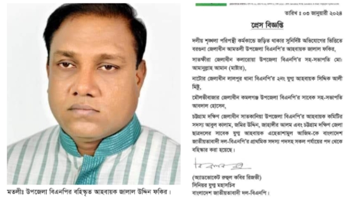 বুধবার দলীয় শৃঙ্খলা পরিপন্থী কর্মকান্ডে জড়িত থাকার সুনির্দিষ্ট অভিযোগে বাংলাদেশ জাতীয়তাবাদী দল বিএনপির সিনিয়র যুগ্ম মহাসচিব অ্যাড. রুহুল কবির রিজভী স্বাক্ষরিত এক প্রেস বিজ্ঞপ্তিতে জালাল উদ্দিন ফকিরকে বিএনপির প্রাথমিক সদস্য পদসহ সকল পর্যায়ের পদ থেকে বহিস্কার করা হয়।