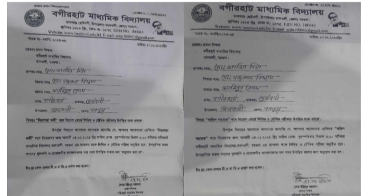 জানাগেছে, গত বছর সেপ্টেম্বর মাসে তালতলী উপজেলার বগীরহাট মাধ্যমিক বিদ্যালয়ে নিরাপত্তা কর্মী, পরিচ্ছন্নতা কর্মী ও অফিস সহায়ক পদে প্রধান শিক্ষক ইদ্রিসুর রহমান একটি পত্রিকায় বিজ্ঞপ্তি দেন। ওই বিজ্ঞপ্তি মোতাবেক তিন পদে ১৫ জনে আবেদন করেছেন। প্রধান শিক্ষক আগামী ৪ জানুয়ারী নিয়োগ পরীক্ষার অংশ নিতে আবেদনকারীদের প্রবেশ পত্র ইস্যু করেছেন। এতে নিরাপত্তা কর্মী ও অফিস সহায়ক পদে মোঃ শাহিন মিয়ার কাছে দুইটি প্রবেশ পত্র ডাক যোগে পাঠিয়ে দেন তিনি। ওই প্রবেশ পত্রে প্রধান শিক্ষক উল্লেখ করেন আগামী ৪ জানুয়ারী বিকেল তিনটার বগীরহাট মাধ্যমিক বিদ্যালয় সম্মেলন কক্ষে নিরাপত্তা কর্মী ও অফিস সহায়ক পদে লিখিত ও মৌখিক পরীক্ষা অনুষ্ঠিত হবে। ওই পরীক্ষায় সকল সনদের মুল কপি ও প্রয়োজনীয় কাগজপত্রসহ উপস্থিত থাকবে হবে। শাহিন মিয়ার অভিযোগ ওই বিদ্যালয়ে নিরাপত্তা কর্মী ও অফিস সহায়ক পদে তিনি আবেদন করেননি। কিন্তু কিভাবে তার নামে নিয়োগ পরীক্ষার (প্রবেশপত্র) কার্ড ইস্যু করা হলো। তার আরো অভিযোগ প্রধান শিক্ষক ইদ্রিসুর রহমান মোটা অংকের টাকার বিনিময়ে ভুয়া আবেদনপত্র দেখিয়ে প্রবেশপত্র পাঠিয়েছেন। এ ভুয়া নিয়োগ বন্ধের দাবী জানিয়েছেন তিনি। এ ভুয়া প্রবেশপত্র ইস্যুর বিষয়ে এলাকার চা ল্যের সৃষ্টি হয়েছে। এ ভুয়া নিয়োগ বন্ধে বুধবার শাহিন মিয়া তালতলী উপজেলা নির্বাহী অফিসারের কাছে লিখিত অভিযোগ দিয়েছেন।