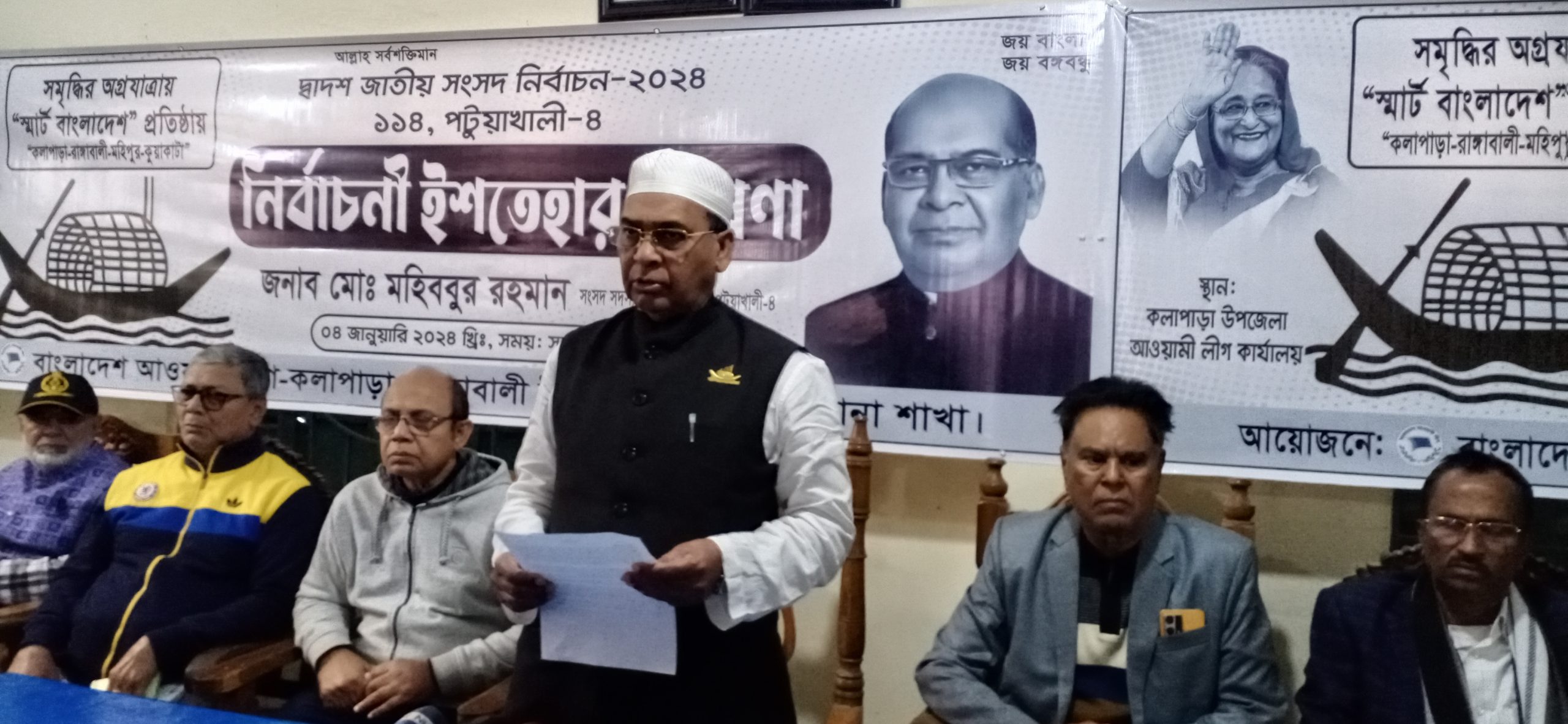 আপন নিউজ অফিসঃ পটুয়াখালী-৪ আসনের প্রতিটি জনপদকে সন্ত্রাস, চাঁদাবাজ, সিন্ডিকেট, সালিশবাজ,মাদক ও ভূমিদস্যুমুক্ত শান্তিময় জনপদ গড়ে তোলার দৃঢ় প্রত্যয় ব্যক্ত করে দ্বাদশ জাতীয় সংসদ নির্বাচনী ইশতেহার ২০২৪ ঘোষণা করেছেন নৌকা প্রতীকের প্রার্থী মো: মহিববুর রহমান।