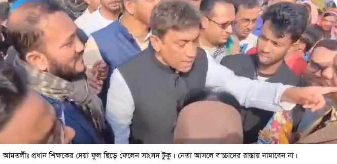 আমতলী প্রতিনিধিঃ প্রাইমারী স্কুলের বাচ্চারা লেখাপড়া করবে, কোন নেতা আসলে বাচ্চাদের রাস্তায় নামাবেন না? আমি এটা পছন্দ করি না। এমন মন্তব্য করে প্রধান শিক্ষক কামরুননাহার আসমার দেয়া ফুল ছিড়ে ফেলেন বরগুনা-১ আসনের নবনির্বাচিত সাংসদ গোলাম সরোয়ার টুকু। এমন একটি ভিডিও মুহুর্তের মধ্যে সামাজিক যোগাযোগ মাধ্যমে ছড়িয়ে পড়ে। এতে সাধারণ মানুষ সাংসদ টুকুর ভুয়াশী প্রশংসা করে অভিনন্দন জানিয়েছেন। ঘটনা ঘটেছে আমতলী উপজেলার আড়পাঙ্গাশিয়া বাজারে মঙ্গলবার দুপুরে।