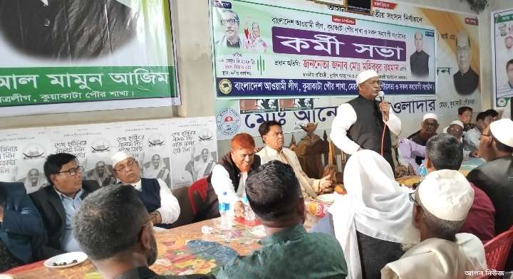 কুয়াকাটা পৌর আওয়ামী লীগের সহ সভাপতি মোঃ তৈয়বুর রহমান’র সভাপতিত্বে আয়োজিত কর্মী সভায় অন্যান্যদের মধ্যে বক্তব্য রাখেন, কুয়াকাটা পৌর আওয়ামী লীগের যুগ্ম সাধারণ সম্পাদক অনন্ত মুখার্জি, সাংগঠনিক সম্পাদক মোঃ মাহমুব আকন, পৌর প্যানেল মেয়র মোঃ মনির শরীফ, পৌর কাউন্সিলর আবুল হোসেন ফরাজী, কাউন্সিলর মোঃ মজিবর রহমান।