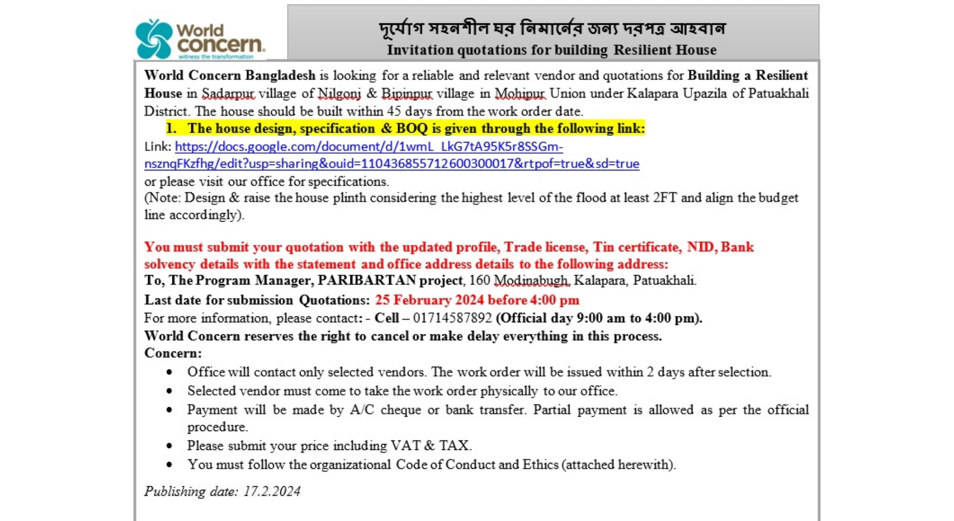 কলাপাড়া উপজেলার মহিপুর এবং নীলগঞ্জ ইউনিয়নে দূর্যোগ সহনশীল ঘর নির্মাণের জন্য দরপত্র আহবান