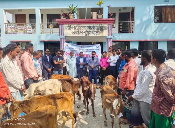 সঞ্জিব দাস, গলাচিপাঃ গলাচিপায় উপজেলা প্রশাসন ও মৎস্য বিভাগ ২০২৩-২৪ অর্থ বছরে “ইলিশ সম্পদ উন্নয়ন ও ব্যবস্থাপনা প্রকল্প” (প্রথম সংশোধিত) বিকল্প কর্মসংস্থানের অর্থনৈতিক সমৃদ্ধি অর্জনে ১২টি ইউনিয়ন ও ১টি পৌরসভায় মোট ২০ জন নিবন্ধিত মৎস্যজীবিদের মাঝে বকনা বাছুর (গরু) প্রদান করা হয়েছে। গতকাল উপজেলা মৎস্য অফিস কার্যালয়ের সম্মুখে বিতরণ অনুষ্ঠানে উপজেলা পরিষদের চেয়ারম্যান মুঃ শাহিন প্রধান অতিথি হিসেবে জেলেদের মাঝে বকনা বাছুর (গরু) হস্তান্তর করেন। বকনা বাছুর (গরু) বিতরণ অনুষ্ঠানে সভাপতিত্ব করেন উপজেলা নির্বাহী অফিসার মোঃ মহিউদ্দিন আল হেলাল।