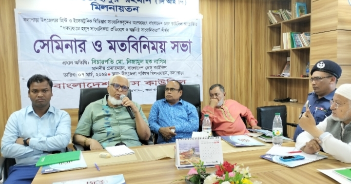 এস এম আলমগীর হোসেনঃ পটুয়াখালীর কলাপাড়া উপজেলার প্রিন্ট ও ইলেকট্রনিক মিডিয়ার সাংবাদিকবৃন্দের অংশগ্রহণে বাংলাদেশ প্রেসকাউন্সিল আয়োজিত “গণমাধ্যমে হলুদ সাংবাদিকতা প্রতিরোধ ও বস্তু নিষ্ঠ সাংবাদিকতা”শীর্ষক সেমিনার ও মতবিনিময় সভা অনুষ্ঠিত হয়েছে। বৃহস্পতিবার বেলা ১১ টায় কলাপাড়া প্রেসক্লাব ইঞ্জিনিয়ার মোঃ তৌহিদুর রহমান মিলনায়তনে সেমিনার ও মতবিনিময় সভায় প্রধান অতিথি ছিলেন বাংলাদেশ প্রেসকাউন্সিলের চেয়ারম্যান বিচারপতি মো.নিজামুল হক নাসিম।