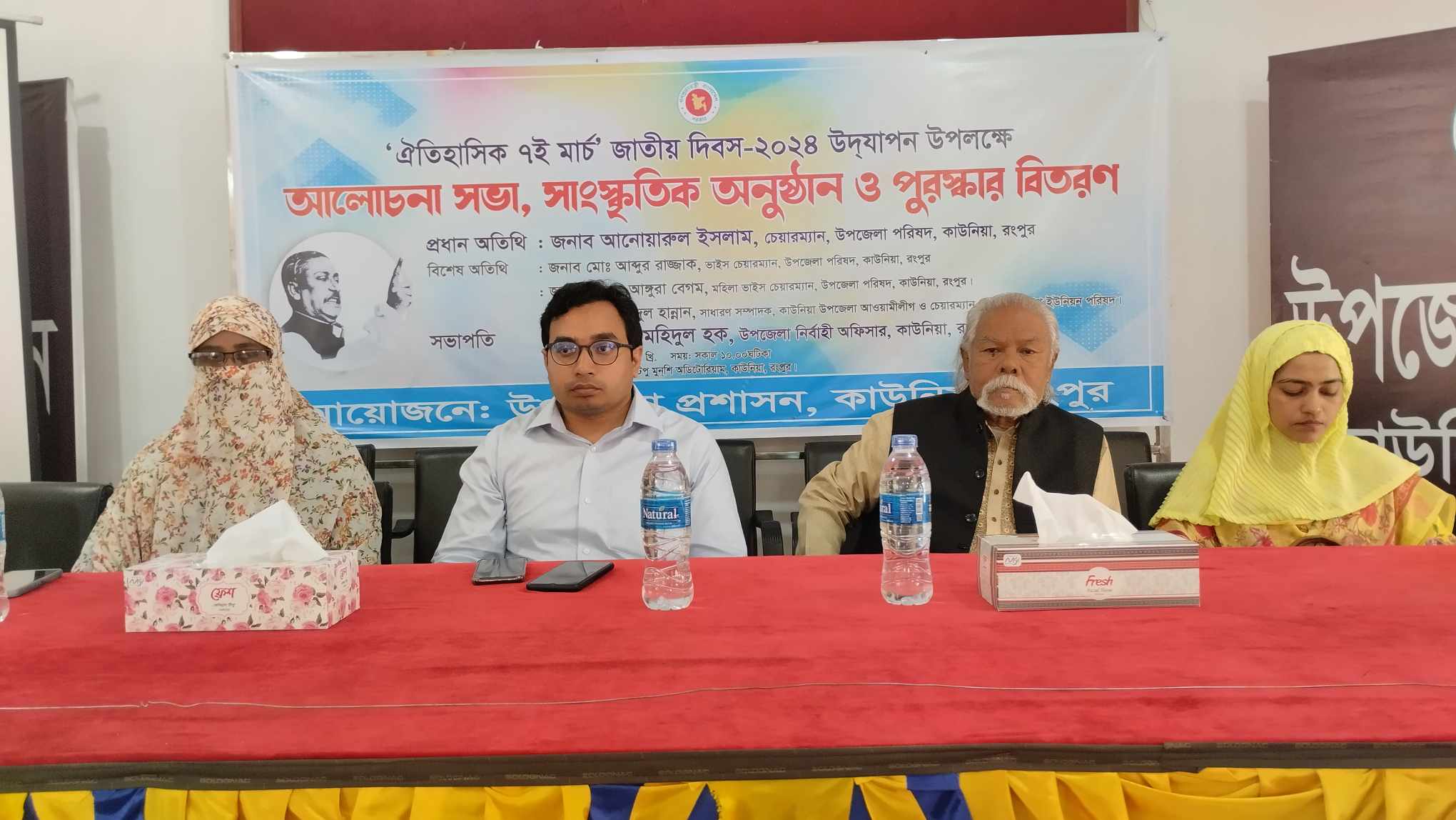 জে এইচ সোহাগ, কাউনিয়া রংপুর প্রতিনিধি: রংপুরের কাউনিয়া উপজেলা প্রশাসন আয়োজনে দিনব্যাপি নানা কর্মসূচির মধ্যদিয়ে ঐতিহাসিক ৭ মার্চ জাতীয় দিবস ২০২৪ পালিত হয়েছে। কর্মসূচিতে ছিলো- চিত্রাঙ্কন ও রচনা প্রতিযোগিতা, কবিতা আবৃত্তি, বঙ্গবন্ধুর কালজয়ী ৭ মার্চের ভাষণ, আলোচনা সভা, পুরুস্কার বিতরণ ও সাংস্কৃতিক অনুষ্ঠান।