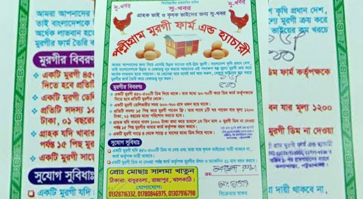 মম্বিপাড়া গ্রামের জেলে হাবিবুর রহমান জানান, ৪ মে বেলা ১১টার দিকে জনৈক সত্তার নামের এক ব্যক্তি তার এক সহযোগীকে নিয়ে পল্লীগ্রাম মুরগী ফার্মের লিফলেট দেখিয়ে মন্নান মিয়ার বাড়িতে আশপাশের নারীদের জড়ো করেন। সেখানে উঠান বৈঠক করে সকলকে মুরগী, মুরগী পালনের খোপ এবং তিন মাসের খাবার দিবেন বলে জানায়। এজন্য প্রত্যেককে প্রথম দফায় পাঁচ শ’ করে টাকা দিতে হবে। এসময় রিনা বেগম নামের একজনকে তাৎক্ষণিক ৪০০-৫০০ গ্রাম ওজনের পাঁচটি মুরগী দেয়া হয়। বাকিদের কাছ থেকে পাঁচ শ’ করে টাকা হাতিয়ে নেয় এবং বলা হয় ১১-১২ তারিখে বাকিদের মুরগী এবং খোপসহ খাবার সামগ্রী দেওয়া হবে। এরপর থেকে জনৈক সত্তার ও তার কথিত ফার্মের নম্বর পর্যন্ত বন্ধ পাওয়া যাচ্ছে। পল্লী গ্রাম মুরগী ফার্মের লিফলেটে লেখা রয়েছে প্রোঃ সালমা খাতুন। ঠিকানা বাধুরতলা, রাজাপুর, ঝালকাঠি।