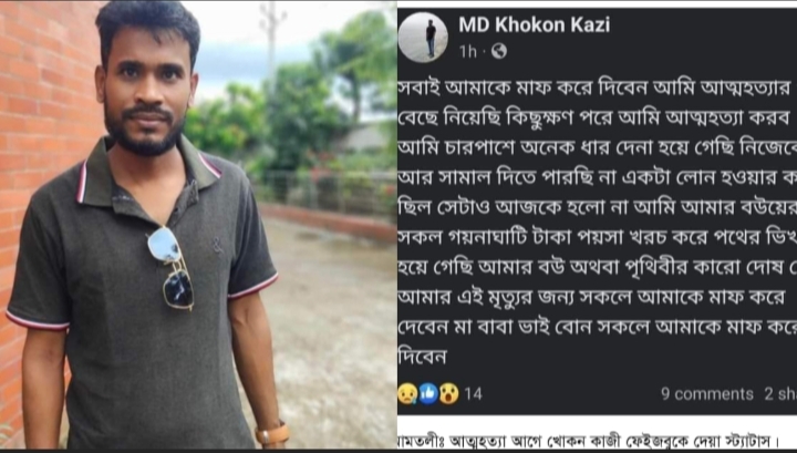 আমতলী প্রতিনিধিঃ “সবাই আমাকে মাফ করে দিবেন, আমি আ'ত্মহ'ত্যা'র পথ বেছে নিয়েছি। কিছুক্ষণ পরে আমি আত্মহত্যা করবো। আমি চার পাশে অনেক ধার দেনা হয়ে গেছি। নিজেকে আর সামলাতে পারছি না। একটা লোন হওয়ার কথা ছিল আজকে তা হলো না। আমি আমার বউয়ের সকল গহনাগাটি টাকা পয়সা খরচ করে পথের ভিখারী হয়ে গেছি। আমার বউ অথবা পৃথিবীর কারো দোষ নেই আমার মৃত্যুর জন্য। সকলে আমাকে মাফ করে দেবেন। মা, বাবা, ভাই ও বোন সকলে আমাকে মাফ করে দিবেন”। ঋণের এক লক্ষ টাকা না পেয়ে বৃহস্পতিবার দুপুর দেরটার সামাজিক যোগাযোগ মাধ্যম (ফেইজবুকে) এমন স্ট্যাটাস দিয়ে আমতলী উপজেলা রেভিনিউ মসজিদের পাশে ব্যবসায়ী খোকন কাজী আত্মহত্যা করেছে। ফেইজ বুকে এমন স্ট্যাটাস দেখে স্বজনরা দ্রæত দোকানে চলে আসে। কিন্তু গিয়ে দেখে দোকানের ফ্যানের সঙ্গে গলায় রশি পেচিয়ে ফাঁস দিয়ে আ-ত্মহ-ত্যা করেছে। স্বজনরা তাকে উদ্ধার করে আমতলী উপজেলা স্বাস্থ্য কমপ্লেক্সে নিয়ে আসে। ওই হাসপাতালের চিকিৎসক তাকে মৃত্যু ঘোষনা করেছেন।