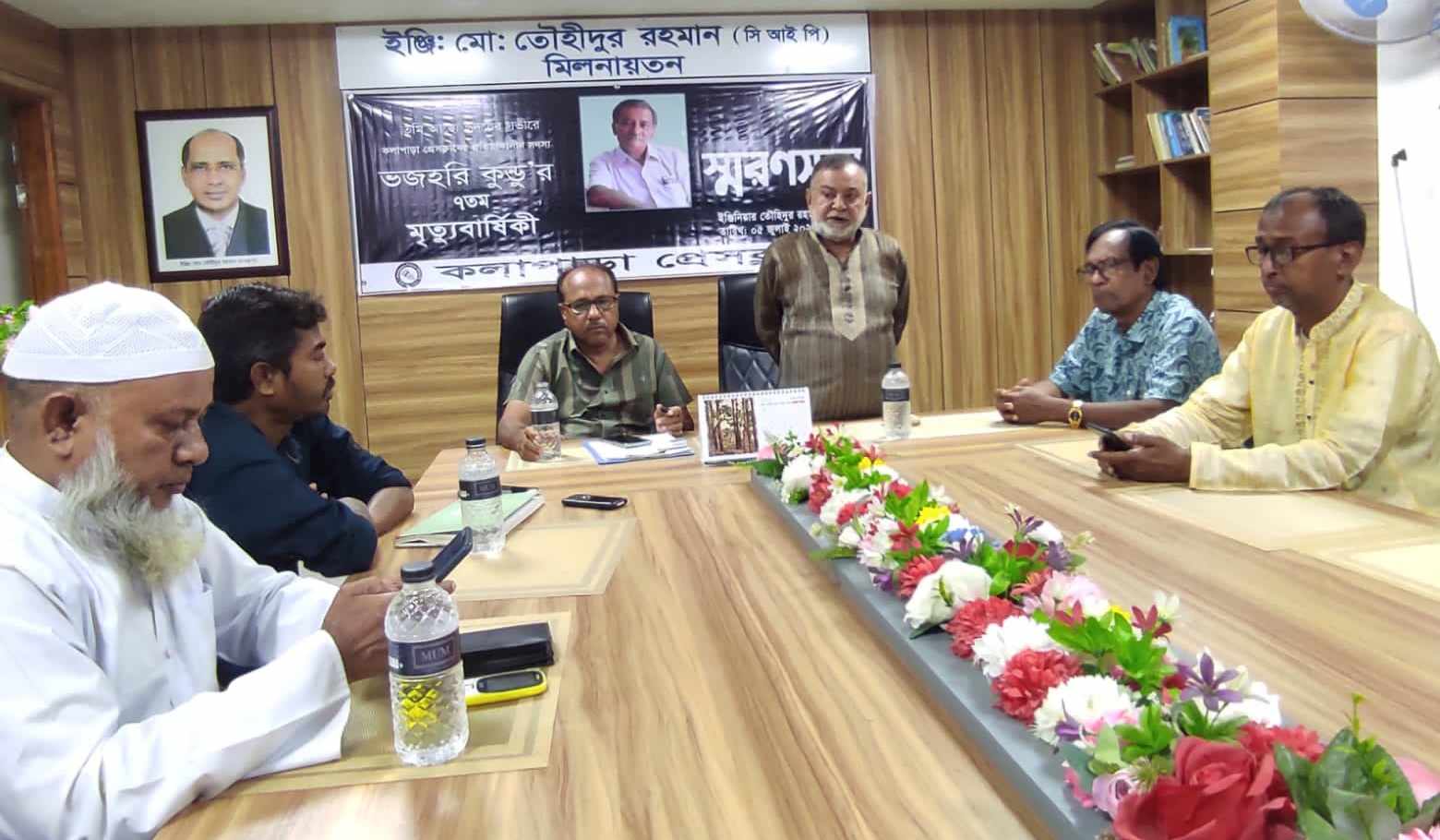 গোফরান পলাশ: দক্ষিণ উপকূলের খ্যাতিমান সাংবাদিক, কলাপাড়া প্রেসক্লাবের প্রতিষ্ঠাকালীন সদস্য ভজহরি কুন্ডু'র ৭ম মৃত্যুবার্ষিকীতে স্মরণ সভা অনুষ্ঠিত হয়েছে। শুক্রবার রাতে কলাপাড়া প্রেসক্লাবের ইঞ্জিনিয়ার মোঃ তৌহীদুর রহমান (সিআইপি) মিলনায়তনে এ স্মরণসভার আয়োজন করে কলাপাড়া প্রেসক্লাব।