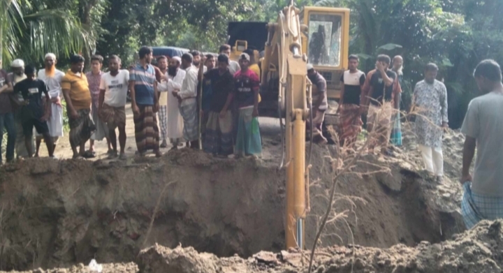 বুধবার সরেজমিনে গিয়ে দেখাগেছে, স্থানীয় ২০-২৫ জন মানুষ বেকু মেশিন লাগিয়ে বন্যা নিয়ন্ত্রণ বাধ কেটে দিচ্ছে। পাশে শত শত যানবাহন দাড়িয়ে আছে।