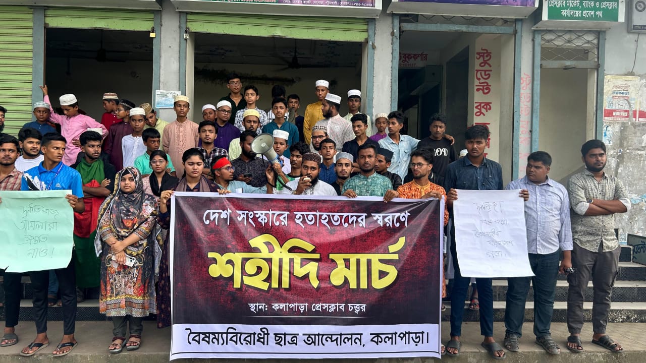 বিশ্বাস শিহাব পারভেজ মিঠুঃ বৈষম্য বিরোধী ছাত্র-জনতার গণ আন্দোলনের মুখে আওয়ামী লীগ সরকার পতনের একমাস পূর্তি উপলক্ষে এবং নিহতদের স্মরনে কলাপাড়ায় ‘শহীদি মার্চ’ অনুষ্ঠিত হয়েছে। বৃস্পতিবার (৫ সেপ্টেম্বর) বিকেল ৪ টায় কলাপাড়া প্রেসক্লাবের সামনে এ বিক্ষোভ মিছিল ও আলোচনা অনুষ্ঠিত হয়। বৈষম্য বিরোধী ছাত্র আন্দোলনের কলাপাড়া শাখা এর আয়োজন করেন।