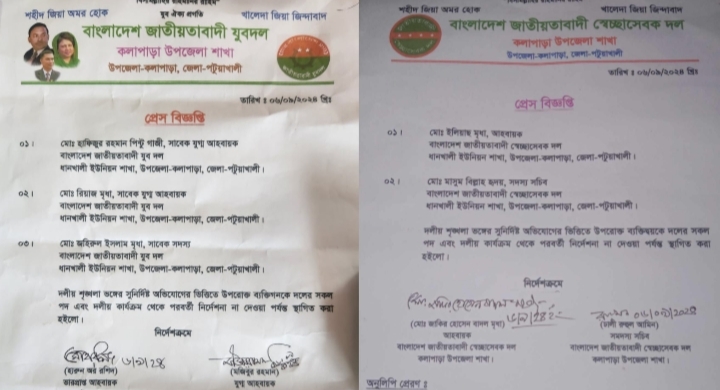 আপন নিউজ অফিসঃ কলাপাড়ায় পৌর ছাত্রদলের সাবেক সহ সভাপতি সহ ৪ জনকে ক'পি'য়ে জ'খ'ম ঘটনায় স্বেচ্ছাসেবক দল ও যুবদলের ৫ নেতা বহিষ্কার। এরা হলেন, উপজেলার ধানখালী ইউনিয়ন স্বেচ্ছাসেবক দলের আহবায়ক মোঃ ইলিয়াছ মৃধা, সদস্য সচিব মোঃ মাসুম বিল্লাহ হৃদয়, ধানখালী ইউনিয়ন যুবদলের সাবেক যুগ্ম আহবায়ক মোঃ হাফিজুর রহমান পিন্টু গাজী, সাবেক যুগ্ম আহবায়ক মোঃ রিয়াজ মৃধা, সাবেক সদস্য মোঃ জহিরুল ইসলাম মৃধা। শুক্রবার ৬ সেপ্টেম্বর কলাপাড়া উপজেলা যুবদল ভারপ্রাপ্ত আহবায়ক হারুন অর রশিদ, যুগ্ম আহবায়ক মোঃ মজিবুর রহমান এবং উপজেলা স্বেচ্ছাসেবক দলের আহবায়ক মোঃ জাকির হোসেন বাদল মৃধা ও সদস্য সচিব ঢালী রুহুল আমিন এর স্বাক্ষরকৃত প্রেস বিজ্ঞপ্তিতে এই তথ্য জানানো হয়েছে।